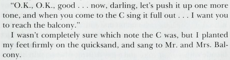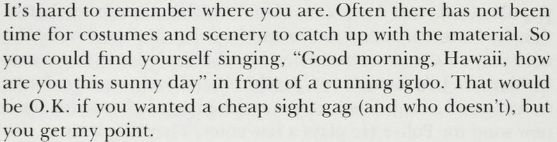 ***If there is such a thing as reincarnation, and we have a choice of identities, how many Sammy Davis, Jr.'s will there be? [Newquist]***"I'd heard that Queen Victoria had a German accent....That was why I wanted to see the Marchioness....I asked her if her grandmother, her majesty Queen Victoria, had any discernible German accent, and she said, 'Ach, no, she hadt no more accent than you or me.'" [Helen Hayes]***NEWQUIST: Are you sensitive about the reviews of your movies?ERNEST LEHMAN: Oh, Lord. You are talking to the seismograph of screenwriters. I can record a bad review in Bombay.[Also, Lehman describes one of his own early writing efforts as a "road-company Jerome Weidman," i.e., a second-rate imitation of Weidman.]***"[A show that failed] sort of spurred me on to bigger and better things. Like never working again." [Phyllis Newman]***"Bob Hope can make you laugh at something that isn't funny, and he goes on to his next joke so quickly you're not aware that you laughed at nothing. He's rhythmed you into it." [Robert Preston]***