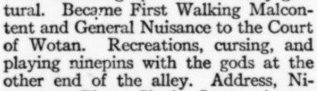 ***No form of humour is more boring than nonalcoholic substitutes for the true wine of swearing as "Great jumping beans!", "Ye little fishes!", "Snakes and ladders!" and "Jam and butter your whiskers, you irregular old Pentagon!"[Naturally, I disagree strongly with the assertion, and the proof is how much I enjoy the examples. (I don't know if Graves spotted any of these in the wild as oaths, or whether, as I hope, he simply imagines them as such, as I would have to assume is at least the case for the last one.)]***[Graves quoting a Sheridan play]"The ancients would never stick to an oath or two, but would say, by Jove! or by Bacchus! or by Mars! or by Venus! or by Pallas! according to the sentiment...this we call the oath referential or sentimental swearing."[Graves himself also makes mention of what he calls "negative swearing," which seems to encompass ironic benedictions as well as oaths so understated that they manage to imply loud, over-the-top cussing.]***[A naughty take on the Cholmondeley phenomenon]In Bigland’s Life and Times of Horatio Bottomley, a famous practical joker, he is said to have protested against this excess of delicacy by introducing himself to a member of the Siddybotaam [i.e., Sidebottom] family as "H, Bumley, Esq."[I think Graves made all of this up, btw.]***