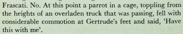 ***"I was getting obsessed about being obsessed with obsessions."***INTERVIEWER: I wonder if we can't see the ghost of a parrot flapping through Staring at the Sun....BARNES: No, I wasn't reminded of Parrot, not at all.[I love that JB refers to his novel Flaubert's Parrot as simply "Parrot," along the lines of "Catcher" or "Streetcar."]***[Barnes mimics the tenor of Continental literary theory.]"In the tenth book of dialogues by Jean-Michel Whoever, the proposition is put forward that..."***[Regarding his time working for the OED.]"I spent three professional years with the language post-1880, in letters C to G. I doubt it shows through in my fiction."***"I don't feel, to put it crudely, that because I've written Flaubert's Parrot I have to write 'Tolstoy's Gerbil.'"***INTERVIEWER: And yet I feel that sometimes you do confuse the reader....BARNES: I only confuse the academic reader.***INTERVIEWER (Xesus Fraga): A novel is like a clock, you just see the time going by, but not the mechanism, the book's structure.***[This bit is from JB's journal, prior to his actually writing "Parrot"; and I don't think "inner sense of parrothood" made it into the novel!]"The bright-green perky-eyed parrot...which irritated him at the same time...as giving him an inner sense of parrothood."***