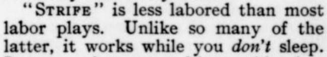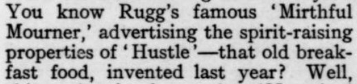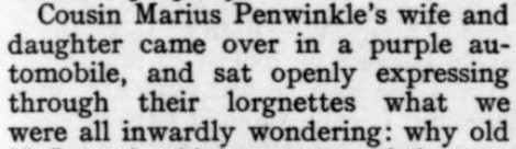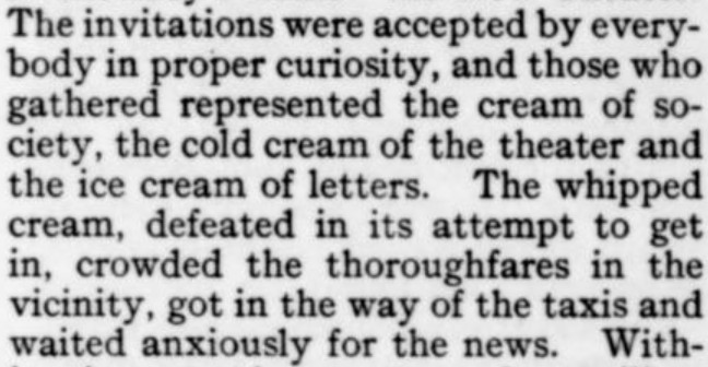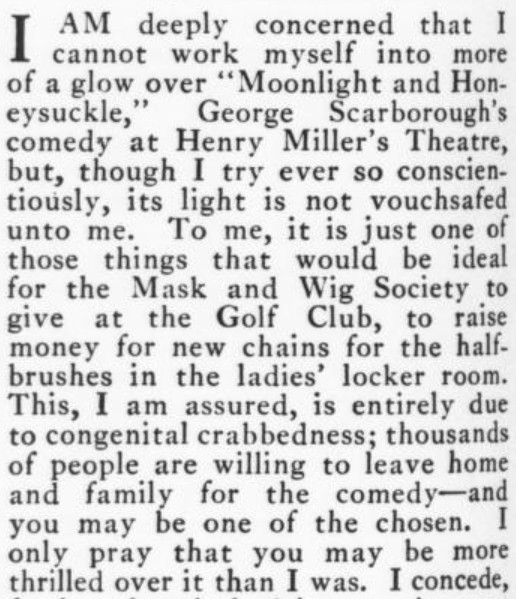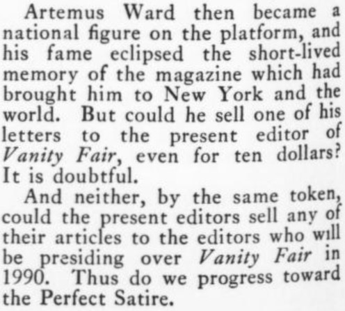 1. I'm including the reference to VF in 1990 because (a) it's one of those future forecasts that falls within our own lifetimes, and (b) the 1919 writer could not have known how lucky he was to pick a distant-future date when VF actually existed, given that there was no VF between 1937 and 1982. Incidentally, they're taking a liberty in linking the ca. 1860 VF--the Artemus Ward one--to the 1913-onward one, as (unlike the 1913-1936 vis-a-vis the 1983- one) they don't seem to have been related apart from exploiting the same name. Even aside from that, there was no U.S. magazine at all called VF for most of the time between 1863 and 1913, so presuming that the then-current (and only six-year-old) VF would last at least until 1990 was quite optimistic--and, continuitywise, incorrect. 2. Since I know you keep track of someone else's honeysuckle, I thought I should include this evidence from a Dorothy Parker column that the play called Moonlight and Honeysuckle was *not* for her. In other words, it was someone else's Moonlight and Honeysuckle--in fact, as she attests, many other people's Moonlight and Honeysuckle. 3. I guess the idea in the Willys Knight (N.B. silly name for a car) illustration is that the car gives the impression of floating above the ground, so smooth is the ride? The ad makes no mention of that conceit, nor does it seem to be represented in the other WK ads I've seen. And I'm guessing the "Overland" in the company name is just a fun coincidence. 4. I have a lot to say about the President Suspenders ad. What first attracted my interest was the letter F that doubles as an arrow. Then, when I began reading the fine print, of course I noted the understated hype of "a most acceptable gift!" But the pièce de résistance, imo, is the claim that the suspenders do their job "unconsciously."