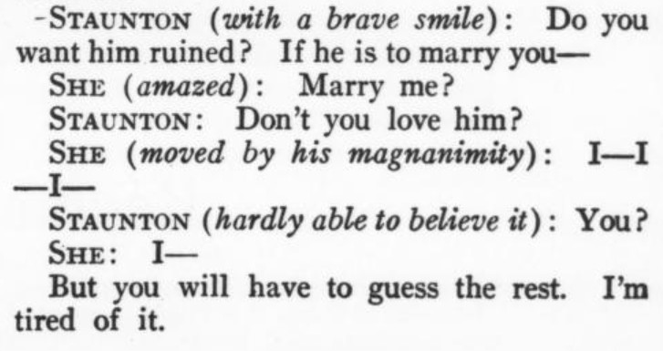 *** TROTTER. If you had been classically educated— FANNY. But I have. TROTTER. Pooh! Cambridge! If you had been educated at Oxford, you would know that the definition of a play has been settled exactly and scientifically for two thousand two hundred and sixty years.