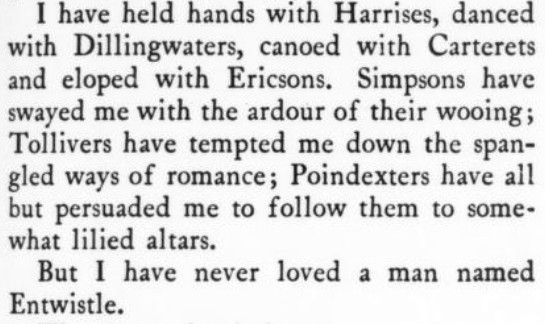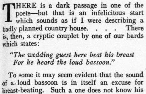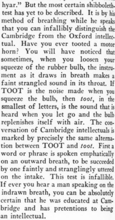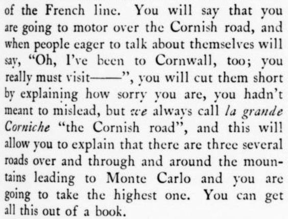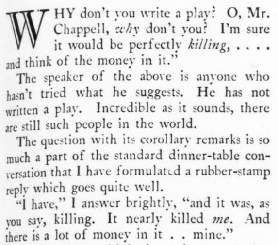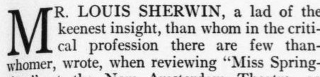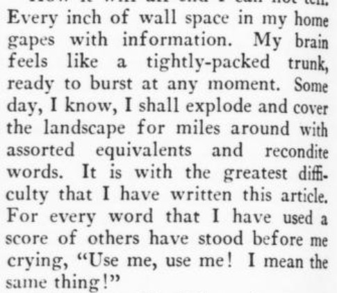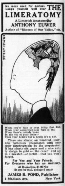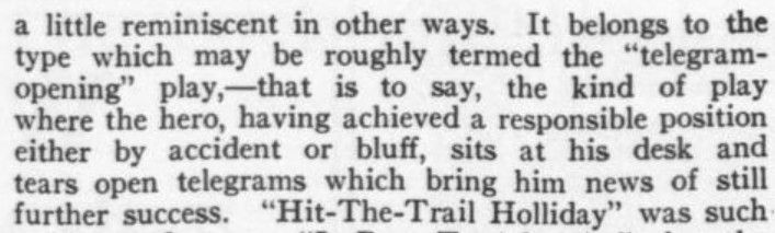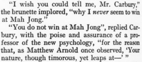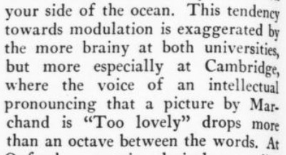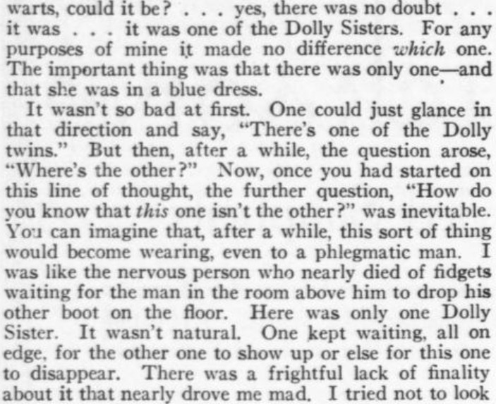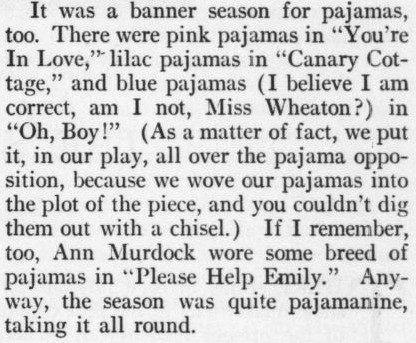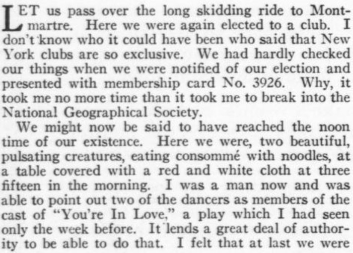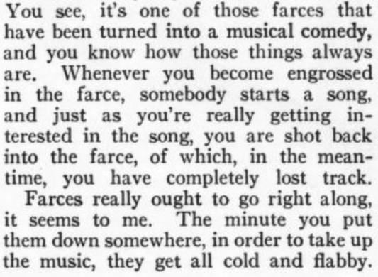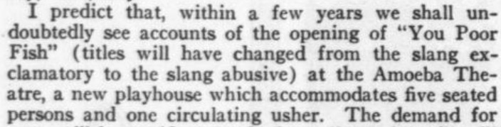 Notes: 1. What first attracted me to the ad for the pearls was the effect of "To Say the Least!" acting as a caption for the illustration of the woman above it, as though it were a decontextualized critical moment from a short story. Then I read the ad copy, which I thought was amusingly perplexing in its own right. It had me trying to do the math, and saying to myself, "Okay...so where exactly does that leave us?" 2. The rest of the attached snippets are from the Nathan piece whose clever title is shown. I like how beans figure in two independent bits, both of which are funny on their own in different ways. The (partial) list, as you may have guessed, represents a ranking of the supposedly funniest things in vaudeville as of even date. Farther down the list (and not shown here) appears "Imprinting a kiss of goodbye on a dollar bill about to be loaned to someone." Nathan appends a comment that his source proved fallible only in saying "Swiss where it should have been Gorgonzola" [attention: "Which Is Funnier?" desk]. Finally, re. the omnipresent "boob," I note that this article precedes by four years Merriam-Webster's earliest known date for "booboisie," a term which as you probably know was associated with (originated by?) Nathan's editorial partner Mencken.