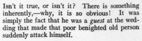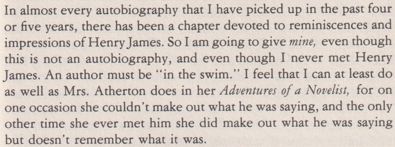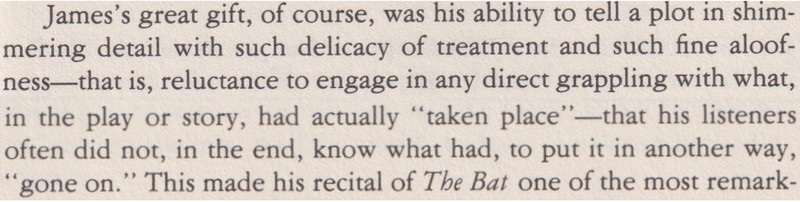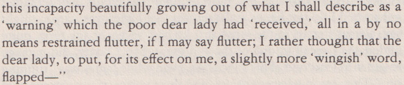 [More snippets attached. Note that the Rhetorical Question Answered segues nicely into one of those "Borgesian, Jamesian..."-style rosters; and the actual Jamesian snippets culminate in some flapping.]