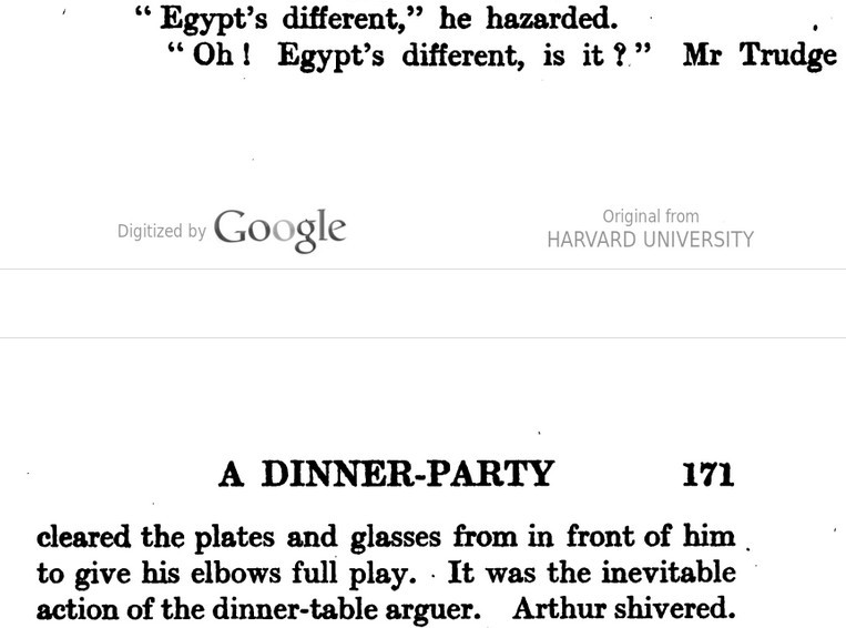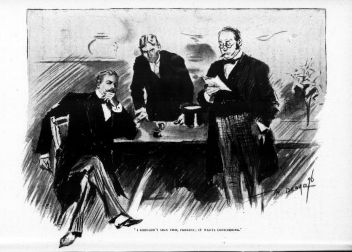 ["The wrong ghost": The illustrator seems to have goofed here: in the story, it's the gentleman at left whose presence has startled the narrator-protagonist, whose appearance in the various illustrations consistently matches that of the gentleman at right (Perkins, as seen in "I shouldn't sign this," seated at left as if he's having his portrait painted by a Royal Academician, and has no intention of signing anything anytime soon.). P.S. The landlady in these stories is called Mrs. Nix. Meanwhile, in some other piece, we have a Mrs. Trivett.]