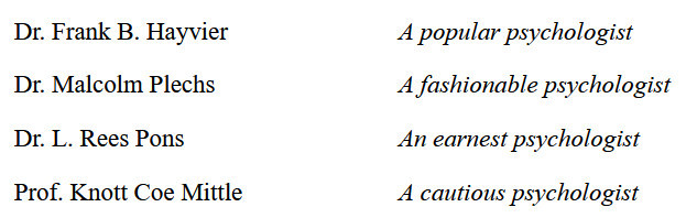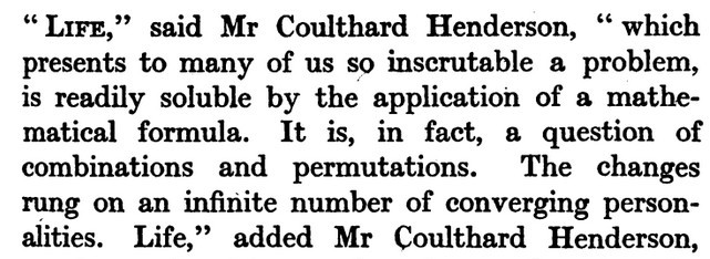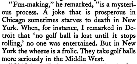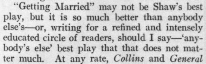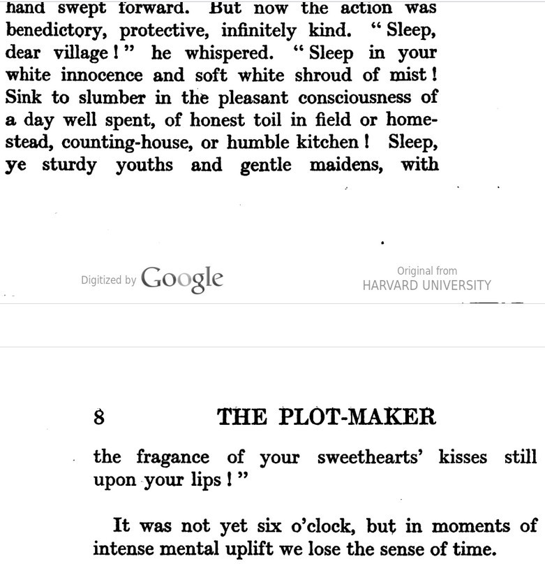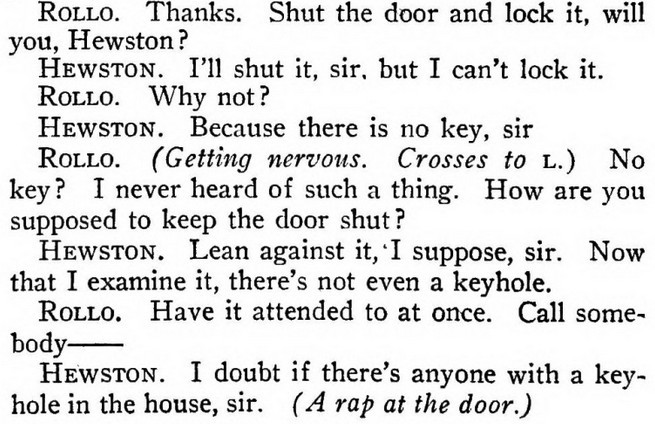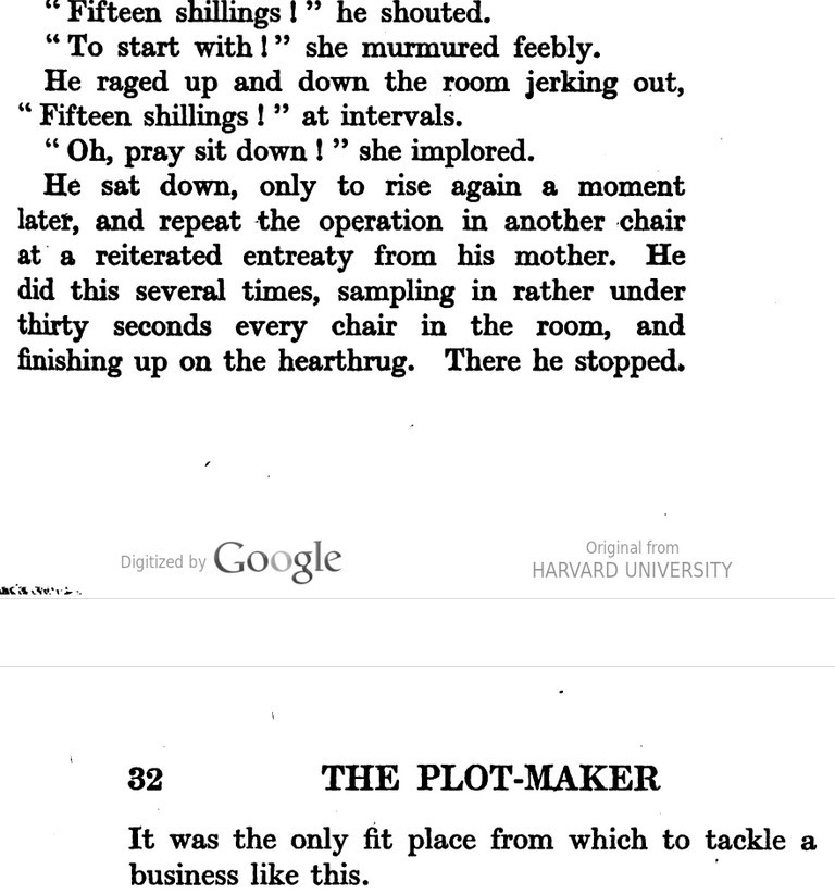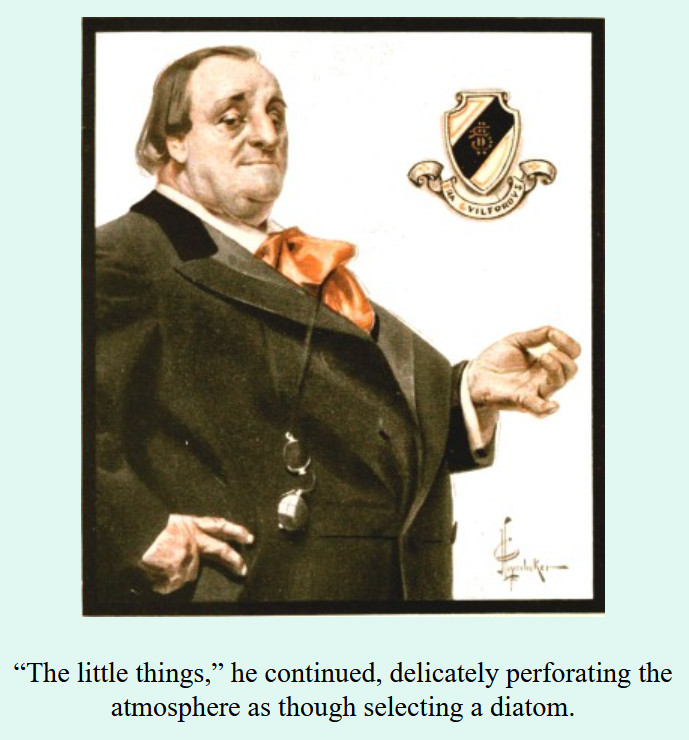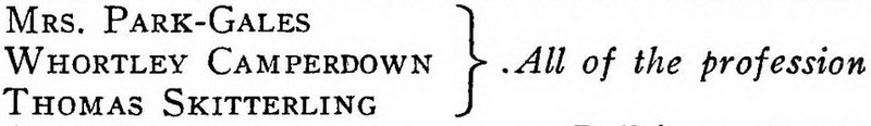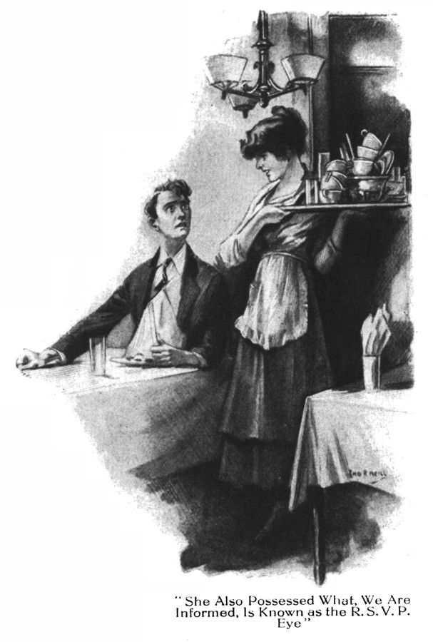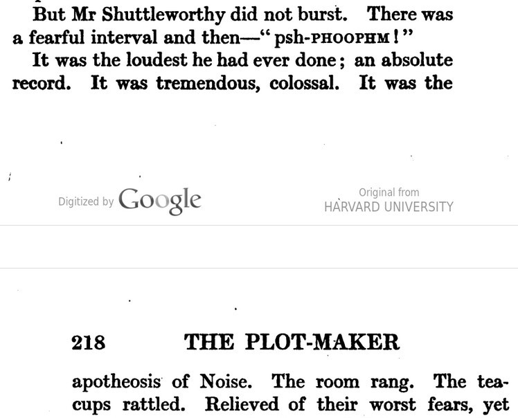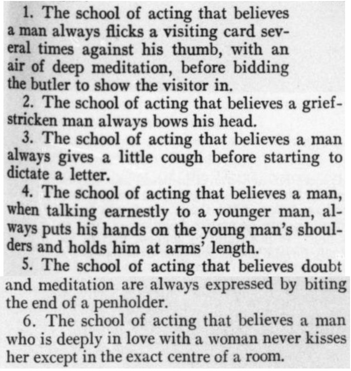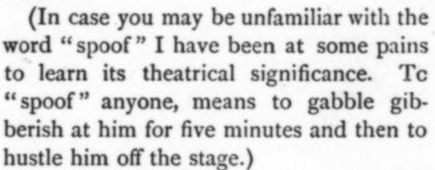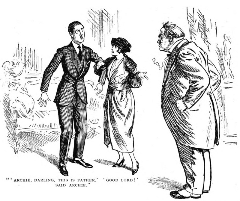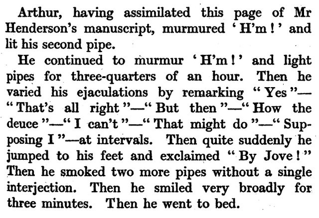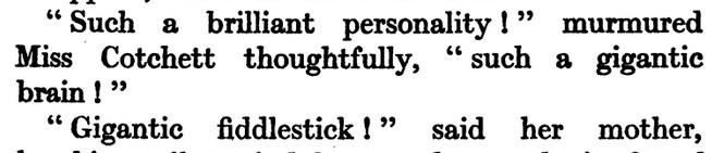 ***The Joyous Eyebrow [fictitious Broadway play]***Blue sea, gleaming Casino, cloudless sky, and all the rest of the hippodrome.***Lord Wildersham (pronounced Wing, to rime with Chiddingfold)***“Oh, don’t try and be funny, for goodness’ sake!” snapped Miss Verepoint. “It doesn’t suit you. You haven’t the right shape of head.”***“Moom?”“It’s spelt M-o-f-f-a-m, but pronounced Moom.”“To rhyme,” said Archie, helpfully, “with Bluffinghame.”***“I would do anything in my power to oblige the friend of a man whose cousin has met my brother at a garden-party, but there are no vacancies, I fear.”***In theatrical circles especially it holds a position which might turn the white lights of many a supper palace green with envy.***“I seen turnips with more spirit in ’em that what you’ve got. And Brussels sprouts. Yes, and parsnips.”***“Some day I knew I should meet the only girl I could possibly love, and then I would pour out upon her the stored-up devotion of a lifetime, lay an unblemished heart at her feet, fold her in my arms and say, ‘At last!’ ”“How jolly for her. Like having a circus all to one’s self.”***The collected jaws of the family fell as one jaw. Muriel herself seemed to be bearing the blow with fortitude, but the rest were stunned. Frank and Percy might have been posing for a picture of men who had lost their fountain pens.***[Cinquevalli again (and last time it wasn't Wodehouse)!]Although Dermot Windleband described himself as a Napoleon of Finance, a Cinquevalli of Finance would, perhaps, have been the more accurate description.***“No, no—I quite see that,” assented Roland. Dermot glanced up at him quickly, wondering whether, after all, he knew a little more than he had appeared to do. Luckily, Roland was trying, at the moment, to look intelligent, so Dermot was reassured.***“Why, if they know you want to buy you’ve as much chance of getting away from them without the paper as—as—well, I can’t think of anything that has such a poor chance of anything.”***[plus two illustrations/captions attached, from PGW stories in periodicals]