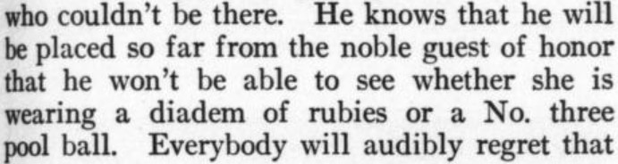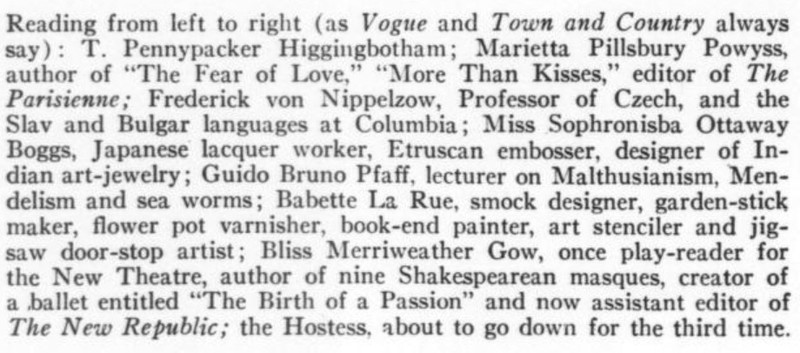 Harry Grant Dart (who it seems was better known as a cartoonist) has a humor piece about being a perpetual "extra man" for formal dinners. Two snippets attached, and here's a bonus: "Mrs. Effington-Smith" (which I'd call an effing good made-up name).