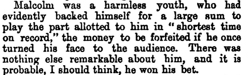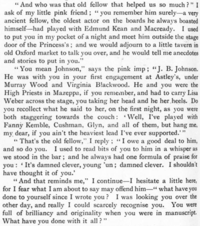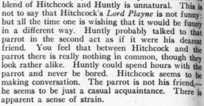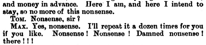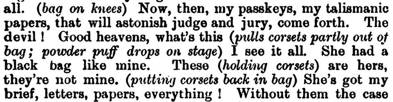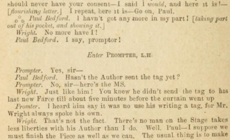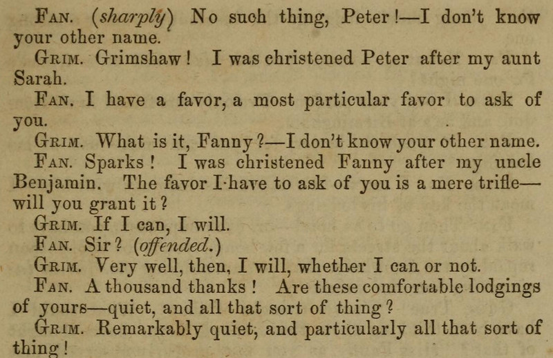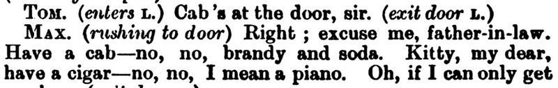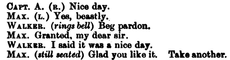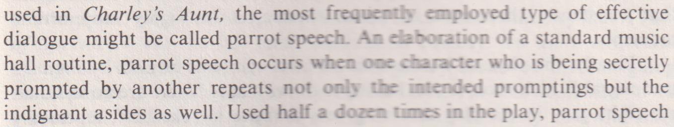*** BUNNY. You, Jonathan, will respond to the double-knocks, and announce the respective guests as they enter the drawing room—thus, (announcing) Mr. and Mrs. So-and-so; rather slow and very plain. JONATH. (imitating) “Mr. and Mrs. So-and-so; rather slow and very plain.” All right, sir. (going) [And, as recently discussed in the Huberman book, this device can be called "parrot talk."]