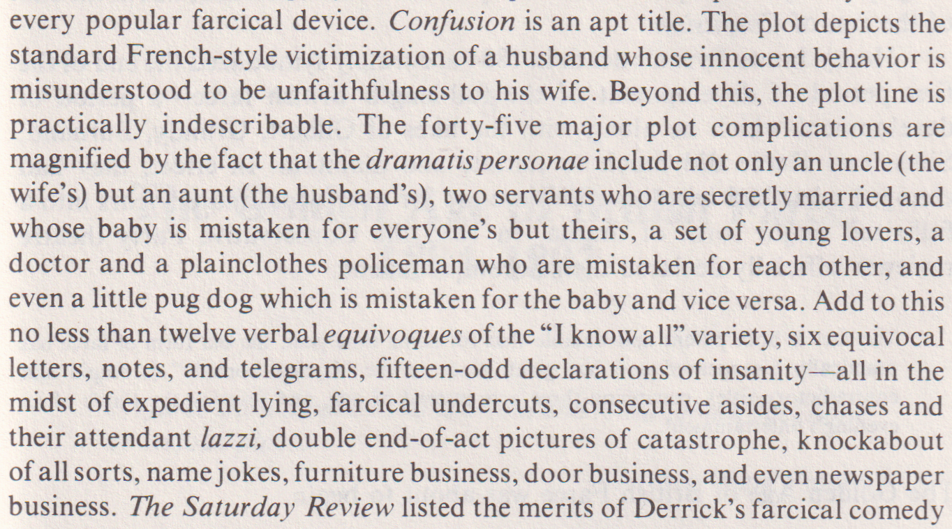 [A few more snippets attached--as you'll see, the farce scholar likes to do the math! It's also fun to encounter new-to-me terminology for familiar devices, e.g., "object-chase" and "parrot speech." Btw, I sought Confusion online and began reading it, but imo it didn't live up to this synopsis. As with Victorian farces I've explored in the past, the dramatis personae (including, in this instance, Mortimer Mumbleford, Christopher Blizzard, and Miss Lucretia Tickleby) were pretty much the highlight.]