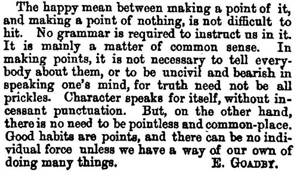 *** [Doing the math on cousins.] ARABELLA. I’ve got three orders for the theatre to-night, will you come? My cousin, Mr. Luke Sharp, has volunteered to escort us. PHŒBE. (aside) Another cousin! that makes the thirty-seventh that I know of. (aloud) Much obliged, but I’m engaged—I’m going to Mr. Bunny’s ball. ARABEL. Well, if you won’t come with us, I’ll say good-bye—Oh, stop! do step down a minute, there’s a good girl, and tell me if my new pork pie suits me. PHŒBE. Pork pie? ARABEL. Yes—my hat; it’s a present from Cousin Benjamin. PHŒBE. (aside) Thirty-eight! ARABEL. Do oblige me, there’s a dear. And, Phœbe—— PHŒBE. Well! ARABEL. I am so puzzled which gown to put on; I know I look best in my peach blossom silk that cousin George gave me; and yet I ought to wear my light blue satin, for cousin Frederick’s sake. PHŒBE. (aside) Forty!