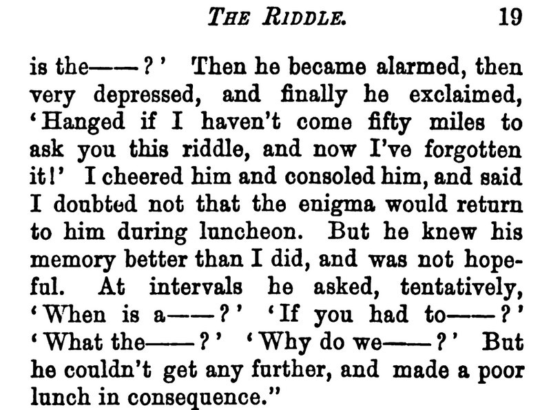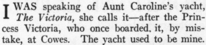 ***"I had no idea, no notion at all, that you knew Mr. Van Adam.""Oh yes.""Besides, I fully understood he was in Florida.""Oh no.""This makes my paragraph all wrong.""Oh yes.""It is really most unfortunate.""Oh no."Mrs. Verulam felt like a pendulum, and that she would go on helplessly alternating affirmatives and negatives for the next century or two. But Mr. Rodney, who, being of a very precise habit, was seriously upset by being given the lie direct—in tweed, too, on a London afternoon of May!—repeated "Oh no!" in accents of such indignant amazement that Mrs. Verulam was obliged to recover her equilibrium."Oh yes, I mean," she said. "Oh yes, yes, yes!"***"The trains are very slow on that line, I believe," Mrs. Verulam added, with a vagueness as to the different railway systems that would have made her fortune as a director.***"You will notice a slight mistake at the close," Mr. Rodney continued in a resentful voice, and glancing from the tweed suit to Mrs. Verulam and back again. "It would not have crept in" (errors have no other gait than that generally attributed to the insect world) "had I known that we were to have the unexpected pleasure of welcoming you to London."***Either Mrs. Lite was unusually clever at making pies, buns, sweetmeats, and cakes, or Mr. Lite had extraordinary business capacity, or Fortune was determined that there should be a Bun Emperor in Britain, and that Mr. Lite looked the part better than anybody else.***Ribton Marches had been built according to Mr. Lite's own ideas, which took the form of a huge erection combining many of the peculiar merits of the Leicester Square Alhambra and the Crystal Palace. Wherever you expected to find stone you came upon glass; wherever you anticipated glass you came upon stone. If you looked for a flat roof, your eye met a cupola; if you glanced up in search of a cupola, you probably missed it and saw a flat roof. The palace continually "had" you. It was full of winter gardens, and in all these winter gardens there were talking parrots. The palace was crammed with echoes, and as you explored it, under the careful and most suspicious supervision of Mr. Lite, its mighty walls seemed to breathe out to you from every side such mysterious expressions as "Hallelujah! Bow-wow-wow!" "Polly, go to bed!" and "Polly very drunk; naughty Polly!" the latter statement being usually succeeded by a loud noise as of the drawing of dozens of champagne corks. There were several libraries in the palace, and several boudoirs; but the boudoirs were on the ground-floor, and the libraries were upstairs.***"You don't know Martha Sage.""But indeed I do," said Mr. Rodney. "She has often dandled me in her arms.""What, recently?""Yes, yes," he rejoined distractedly; "often and often."[...]"When I was a little boy—when I was a child," said Mr. Rodney, recovering himself in time to save Lady Sage's vanishing reputation with the Duchess."Oh, that's nothing. She has dandled everybody at that age. But she doesn't allow anybody to influence her decisions for all that."***"Oh, Mr. Bush!" she added, with a most tender accent of commiseration, "I can scarcely tell you how grieved, how horrified I am that you should have been so nearly murdered—and so soon after your arrival, too!"***Mr. Harrison, above stairs, was with much tribulation and uncurled whiskers preparing his report to lay before the Emperor at eight o'clock on the following morning.***"Have any more thoughts been taking you like a storm, Marriner?""They have indeed, ma'am.""If you think so much you ought to keep a lifeboat by you," said Mrs. Verulam dreamily.***"Lady Sage grows a little wearisome, I fancy," he murmured dissuasively."Do you think so? Oh, I love her recollections!""I think her too historical for hot summer weather, I confess," continued Mr. Rodney***"There's a great deal of knack in sitting a wooden horse," said the Duke.***"Duchess," she said, "Mr. Bush, you must know, is full of maxims.""Dear me! Is he related to a copy-book?" replied her Grace lethargically.[...]Mr. Bush added, after a moment of deep thought:"Look after the sheep, and the sheep'll look after you!""It sounds like 'Diana of the Crossways,'" piped Lady Drake in her acidulated manner."I don't know that I should care to be looked after by a sheep," said Miss Bindler practically, as she lit a small cigar. "I don't consider a sheep to be an efficient animal."[...]"Oh, I feel sure that even a sheep is deeply, deeply interesting, if properly studied," she said."Aye," said Mr. Bush."It's what we bring to a thing, isn't it?" she added, greatly encouraged."What would you bring to a sheep?" said Miss Bindler."Swedes,*" said Mr. Bush, before Mrs. Verulam could make reply.[*i.e., turnips]***"Dear me! I had no idea that—that"—she searched her mind hurriedly for an appropriate American name—"that Vancouver intended to come over this summer."***"Certainly," she said, idly watching Lady Cynthia Green, who was making puns to Sir Brigham Lockbury in the middle distance—"certainly.""Mrs. Verulam," he continued, without much subtlety of exposition, "you are marching to your doom—you are indeed! And all for what?""I beg your pardon?""Well, all for which—whom?" he cried in an under voice, seeking grammar.***"Not far," rejoined the paragon—"not far!" And he laughed like Fee-faw-fum.***His expression was like the third act of a melodrama.***[Walking to Conclusions dept.]The paragon, whose wits were slightly sharpened by cowardice, immediately walked to the conclusion that Mrs. Verulam had observed his ostentatious secrecy with the Duchess.***He...led her among the parading horses, getting so entangled with the four legs of the favourite that it seemed as if his one ambition was to become a centaur before evening.***"It is to say that they have discovered Yillick," answered Mrs. Verulam in an unemotional voice."I beg your pardon?""I say they have discovered Yillick," she cried irritably."Indeed! What is that?""I don't know.