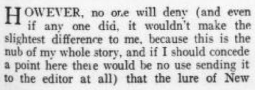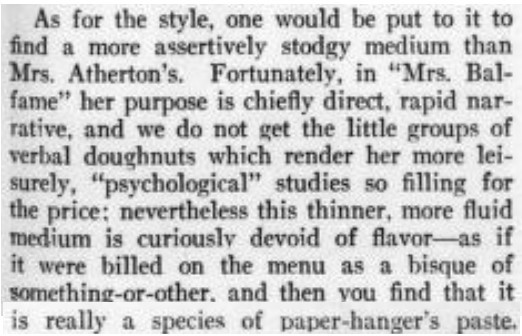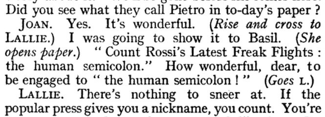 *** “I wonder whether the supremacy of Eustace Lane is moral, or intellectual, or—neither?” said Winifred. “There are so many different supremacies, aren’t there? I suppose a man might be supreme merely as a—as a—well, an absurdity, you know.” Jenny smiled the watery smile of the sentimentalist; a glass of still lemonade washed with limelight might resemble it.