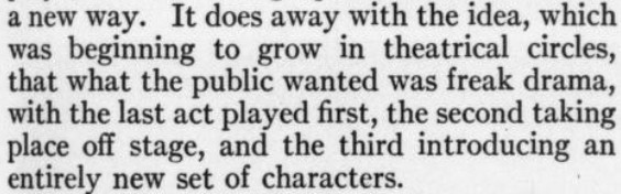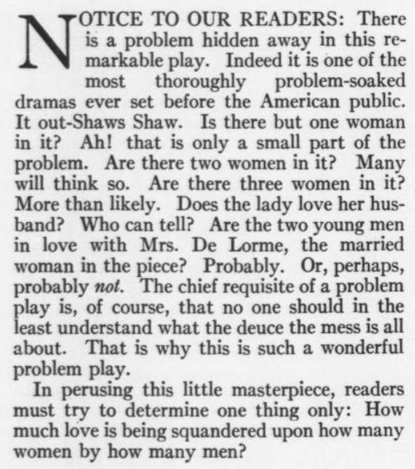 Doing the math, I note that Plum appears FIVE times in this issue (under four different names, with one theater-crit roundup and four humor pieces). Incidentally, this same issue that featured a didactic Gillette saying that plays were meant to be performed, not read, has a waggish Wodehouse touting score-reading at home as a way to avoid going to the opera without losing face.Speaking of Gillette, here also is some Benchley, who manages to get a word in edgewise despite the PGW monopoly. They also made room for "The Brocaded Wrap: An Almost Unsoluble Problem Play," by Louise Closser Hale (which, as Gillette would agree, would probably be more fun to see performed than to read, as there's lots of visual farce business). I note that an onstage "damn" in 1916 is the equivalent of the obligatory "Shit!" in latter-day movies seeking to avoid a G rating and cash in on a cheap laugh.Or why not throw a Vanity Fair cover party?