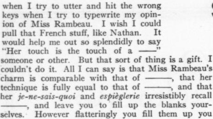 I liked this piece:"Oratorical Platformation"https://archive.org/details/sim_vanity-fair_1916-08_6_6/page/46/mode/2up?view=theaterMore tidbits attached. "Lotta Miles" is, technically, left over from the last issue--but, heck, she'll probably show up again in September, so who's counting? The Judge magazine ad copy was funny to me because, hey, you name your periodical "Judge," then feel obliged to bend over backward explaining how nonjudgmental it is. And here's what I said about the Florence Nash portrait on Facebook:Please know that I'm not mocking anybody's "resting face" when I say that, given the sober, thoughtful expression in this nice portrait photo, the caption writer is inviting wisecracks. I might have revised it to "blessed with a genius for comedy [not shown]"; or maybe "blessed with a genius for very, very dry, deadpan, understated comedy, which, when you build up to it in the right way in a well-engineered context, can be highly amusing indeed." Looking at other photos of Nash from this earlier part of her career, she does generally look pretty deadpan. I can't find relevant film footage (the famous movie that she's in was from much later), but it would be interesting to see if she deadpanned through everything à la Buster Keaton. If she was famous enough as a deadpan comedian at the time this magazine came out (1916) that the audience would already be familiar with that personality, then maybe the caption writer did fine. It's not the caption writer's fault that, 100+ years later, I know who Keaton was but not who Nash was!