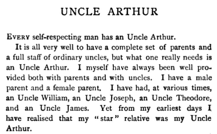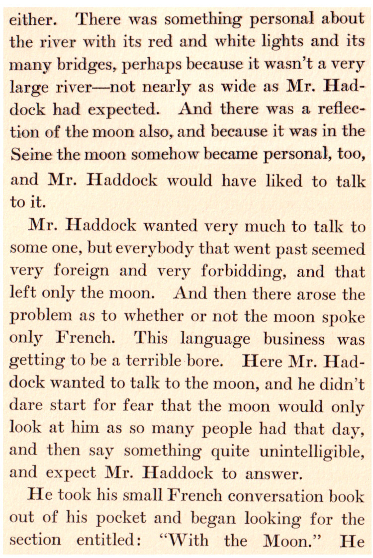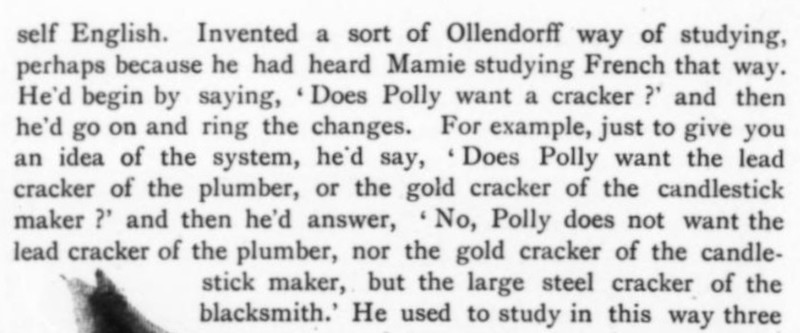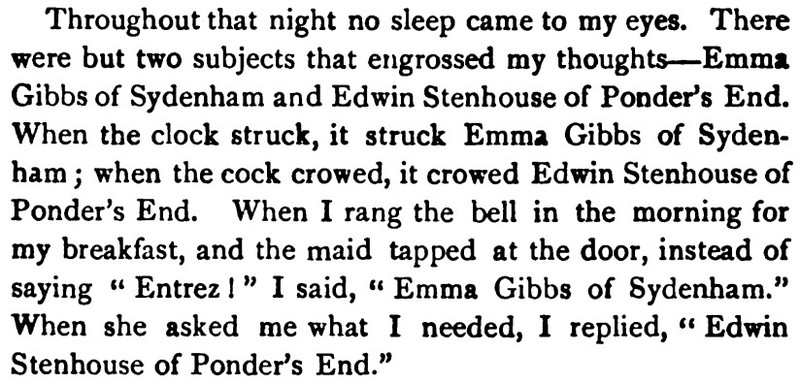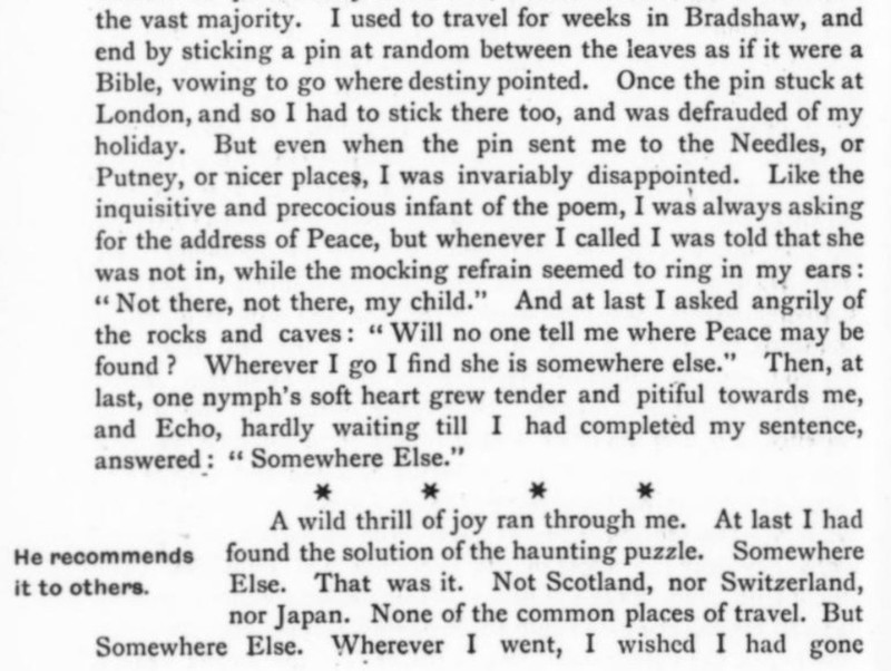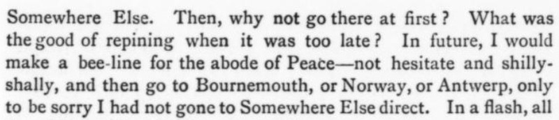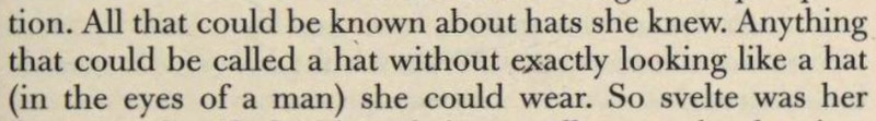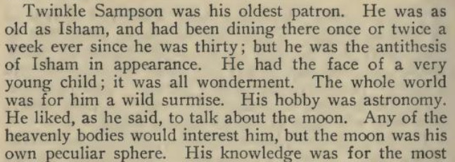 ***The April skies glowed with benevolence this Saturday morning. The Metropolitan Tower was singing, bright ivory tipped with gold, uplifted and intensely glad of the morning. The buildings walling in Madison Square were jubilant; the honest red-brick fronts, radiant; the new marble, witty. The sparrows in the middle of Fifth Avenue were all talking at once, scandalously but cleverly.***“You’re the brother-in-law to a wise one,” commented the Brass-button Man.[This seems to be a compliment, meaning "you're smart to do that." But the only Google Books results for the phrase come from this very line in this very novel.]***A day of furtive darts out from his room to do London, which glumly declined to be done.***[Punctuation Marks Bearing the Full Burden dept.]“And how do you place Nietzsche?” she gravely desired to know.“?”“Nietzsche. You know—the German humorist.”***"I think I’ll go back to Paris. There even the Interesting People are—why, they’re interesting."***"There’s tea at five dollars a cup that they advertise is grown on ‘cloud-covered mountain-tops.’ I suppose when the tops aren’t cloud-covered they only charge three dollars a cup."***[Culteranismo dept.]"That’s playing. With words. My aged parent calls it ‘talking too much and not saying anything.’ Note that last—not saying anything! It’s one of the rules in playing that mustn’t be broken.”He understood that better than most of the things she said. “Why,” he exclaimed, “it’s kind of talking sideways.”***“And eat them without buttering your nose. For if you butter your nose they’ll think you’re a Greek professor. And you wouldn’t like that, would you, honey?”***He ate his dinner with a grave courtesy toward the food and the waiter. He was positively courtly to his fork.***Yet when dear Carson had jauntily departed, leaving the room still loud with the smack of his grin, Istra seemed to have forgotten that Mr. Wrenn was alive.***The Aengusmere Caravanserai is so unyieldingly cheerful and artistic that it makes the ordinary person long for a dingy old-fashioned room in which he can play solitaire and chew gum without being rebuked with exasperating patience by the wall stencils and clever etchings and polished brasses. It is adjectiferous. The common room (which is uncommon for [a] hotel parlor) is all in superlatives and chintzes.***"Now do tell us all about it, Mr. Wrenn. First, I want you to meet Miss Saxonby and Mr. Gutch and dear Yilyena Dourschetsky and Mr. Howard Bancock Binch—of course you know his poetry.”And then she drew a breath and flopped back into the wing-chair’s muffling depths.***“Gee! I talked to that omelet Berg’ rac like I’d known it all my life!”***Mrs. Arty—Mrs. R. T. Ferrard is her name, but we always call her Mrs. Arty.***The profusion of furniture was like a tumult; the redness and oakness and polishedness of furniture was a dizzying activity.***A general grunt that might be spelled “Hmmmmhm” assented.***"I’m getting sick of Paris and some day I’m going to stop an absinthe on the boulevard and slap its face to show I’m a sturdy moving-picture Western Amurrican."***Setting up his box stage, he glued a pill-box and a match-box on the floor—the side of the box it had always been till now—and there he had the mahogany desks. He thrust three matches into the corks, and behold three graceful actors—graceful for corks, at least.***"Where’s N? Oh, how clever of it, it’s right by M."***Besides, it wasn’t as if he were engaged to Nelly, or anything like that. Besides, of course Istra would never care for him. There were several other besideses with which he harrowed himself while trying to appear picnically agreeable.***