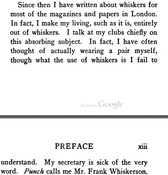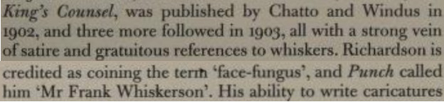 [This so-called mystery novel, first published in 1907 as 2835 Mayfair, might be better described as a steampunk-horror paranormal transgender romance. (I'm not trying to be funny; it seems to be a quite remarkable--and largely forgotten--book for its time.) Most of the comic relief pertains to whiskers, which I've learned was Richardson's claim to fame. (You'll recall "Mainly about Whiskers" as a chapter title in the previous Richardson book I read.) Among the attachments here, the one called "face-fungus" comes from the 2015 preface to a reprinted edition (and the OED does show Richardson as the first citation for the term); the others are from the body of the book, and only the vast majority of them involve whiskers. Incidentally, the supporting character who is obsessed with whiskers, "Frank Robinson," is presumably the author's self-parody--and Robinson is disliked by his club acquaintances, so Richardson obviously has a sense of humor about himself.][Bonus: an offstage character called the Hon. Otho Trigg]