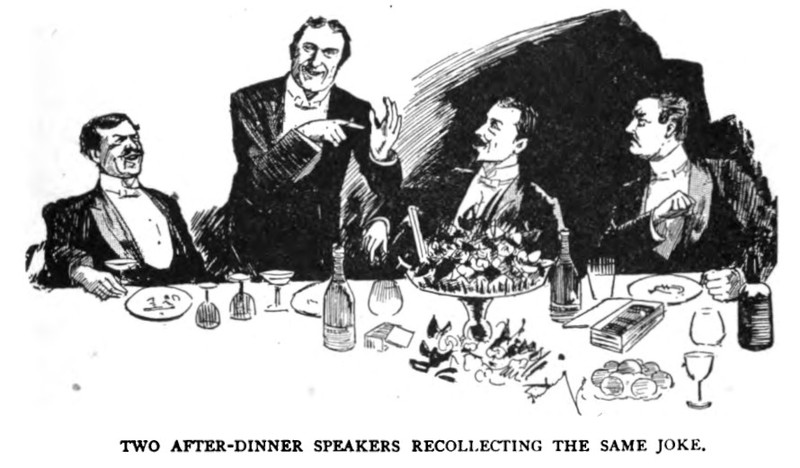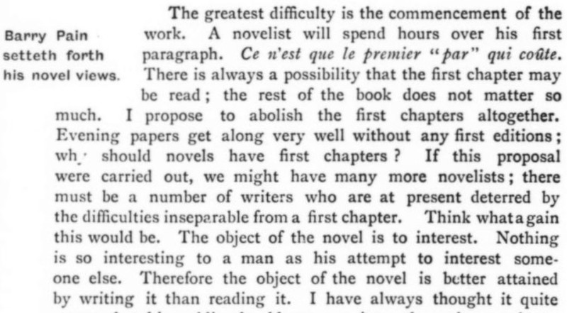 [from "To the Editor: Sir..."]A novel, after all, is rather a commercial sort of affair. A letter to the papers is Art for Art's sake.[from "An Outline of Shakespeare"]The fact that the anniversary of Shakespeare's birth appears this year....[That's the beginning of the piece; and, as I did the math, I found myself puzzled, because neither the date of its original publication, nor that of its being reissued in the collection in which I found it, seemed to match up with the 400th anniversary of the Bard's birth. But then I reread PGW's sentence--and noticed that he never said it was the 400th anniversary, or any particular anniversary at all! Technically, all he said was that Shakespeare's birthday was on the calendar that year. Ha![ditto]"Is there anything else!" cried Shakespeare. "Why, there's nothing else but something else."[from "Prospects for Wambledon"]It simply shows--well, I cannot at the moment think just what it does show, but it obviously has a significance of some sort.[I'm including that just because it's some sort of JC-E precursor.][from "Fashionable Weddings and Smart Divorces"][a couple of bride's family-groom's family pairings]Bootle - BartholomewMumbleby - Packsmith