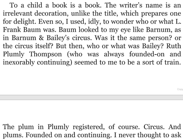 [In case Rigmarole Town is new to you, as it was to me (until Gore Vidal, of all people, pointed me to it).]"Is this Rigmarole Town?""Sir," replied the boy, "if you have traveled very much you will have noticed that every town differs from every other town in one way or another and so by observing the methods of the people and the way they live as well as the style of their dwelling places it ought not to be a difficult thing to make up your mind without the trouble of asking questions whether the town bears the appearance of the one you intended to visit or whether perhaps having taken a different road from the one you should have taken you have made an error in your way and arrived at some point where—""Land sakes!" cried Aunt Em, impatiently; "what's all this rigmarole about?""That's it!" said the Wizard, laughing merrily. "It's a rigmarole because the boy is a Rigmarole and we've come to Rigmarole Town.""Do they all talk like that?" asked Dorothy, wonderingly."He might have said 'yes' or 'no' and settled the question," observed Uncle Henry."Not here," said Omby Amby. "I don't believe the Rigmaroles know what 'yes' or 'no' means."While the boy had been talking several other people had approached the wagon and listened intently to his speech. Then they began talking to one another in long, deliberate speeches, where many words were used but little was said. But when the strangers criticised them so frankly one of the women, who had no one else to talk to, began an address to them, saying:"It is the easiest thing in the world for a person to say 'yes' or 'no' when a question that is asked for the purpose of gaining information or satisfying the curiosity of the one who has given expression to the inquiry has attracted the attention of an individual who may be competent either from personal experience or the experience of others to answer it with more or less correctness or at least an attempt to satisfy the desire for information on the part of the one who has made the inquiry by—"[...]"If those people wrote books," Omby Amby remarked with a smile, "it would take a whole library to say the cow jumped over the moon."