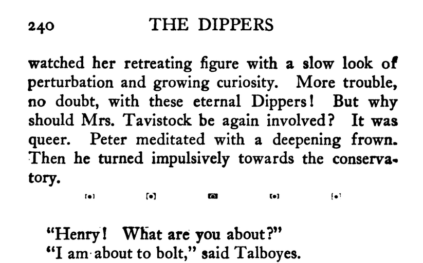 ***The various appliances attached to the bath were stamped respectively with small metal tallies: "wave," "splash," "plunge," "shower," "surf," "gurge," "swash" and "tornado."[...]"Never mind," replied Mrs. Tavistock. "When I have my bath I'll try swashing for a start."***"I have sometimes seen English girls dancing quite as well in my opinion as some of the Russian prima ballerine, even those with the longest names."***"All these butlers and chauffers and footmans--feetmen--foot--"***Mr. Harry Pink was there...one of those...country gentlemen who may be counted on to do the right thing in the wrong way.***Mrs. Duckingham-Leape [of Coombe Puddy]...was...chattering with the irrelevant pertinacity of a parrot. [This is the first parrot encounter worth noting in a while!]***The twin imps of mischief and humour are always on the heels of wit, alert for a commision.***Bonuses:Moffat, Yard and CompanyMr. and Mrs. Buzzard KnowlesMiss Blanche ScollopAnd some interesting dingbats [attached].