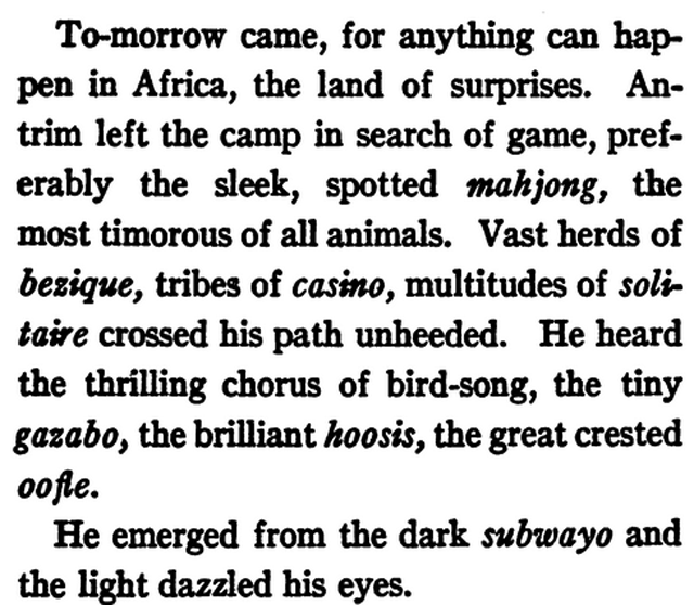 ***[On the question of reviving archaic words.]As for "Welkin," "Lush," and "Bosky"--who dares to lead their metric feet into the prim paths of prose? Let bygones be bygones.***My words will be imaginotions, penandinkumpoops, whimpusles, mere boojums rather than classic snarks, for I shall not construct “Portmanteau” words, like Lewis Carroll.***The frequent use of the “oo” will perhaps require an apology, and the almost equally merry “aw.” The other “long” vowels, such as “ee” and “ay” and “o” seemed inadequate to my use. Of consonants, my “G” is, no doubt, most frequent. “G” supplies spuzz to a word that can hardly be obtained elsewhere in the alphabet. “K” also has a bite, but it is frequently too suggestive for our delicate susceptibilities. “L”—what could one do in such a work, without the gentle liquid that euphonizes the most savage of consonants! Also I confess having fallen in love with the anapest.***Oo´fle, n. 1. A person whose name you cannot remember. 2. A state of forgetfulness regarding a friend or thing.Oo´fle, v. 1. To try to find out a person’s name without asking. 2. To talk to an unknown person without introducing him to a nearby friend.***Tashivation. The art of answering without listening to questions.***Tin´tid-dle, n. 1. An imaginary conversation. 2. A witty retort, thought of too late, a mental postscript.***Unk. An unwelcome, inappropriate or duplicate present.***Wijjicle. A perverse household article, always out of order. [One of those recalcitrant "things"!]***Zobzib. An amiable blunderer, one displaying misguided zeal.***https://www.gutenberg.org/files/59004/59004-h/59004-h.htm