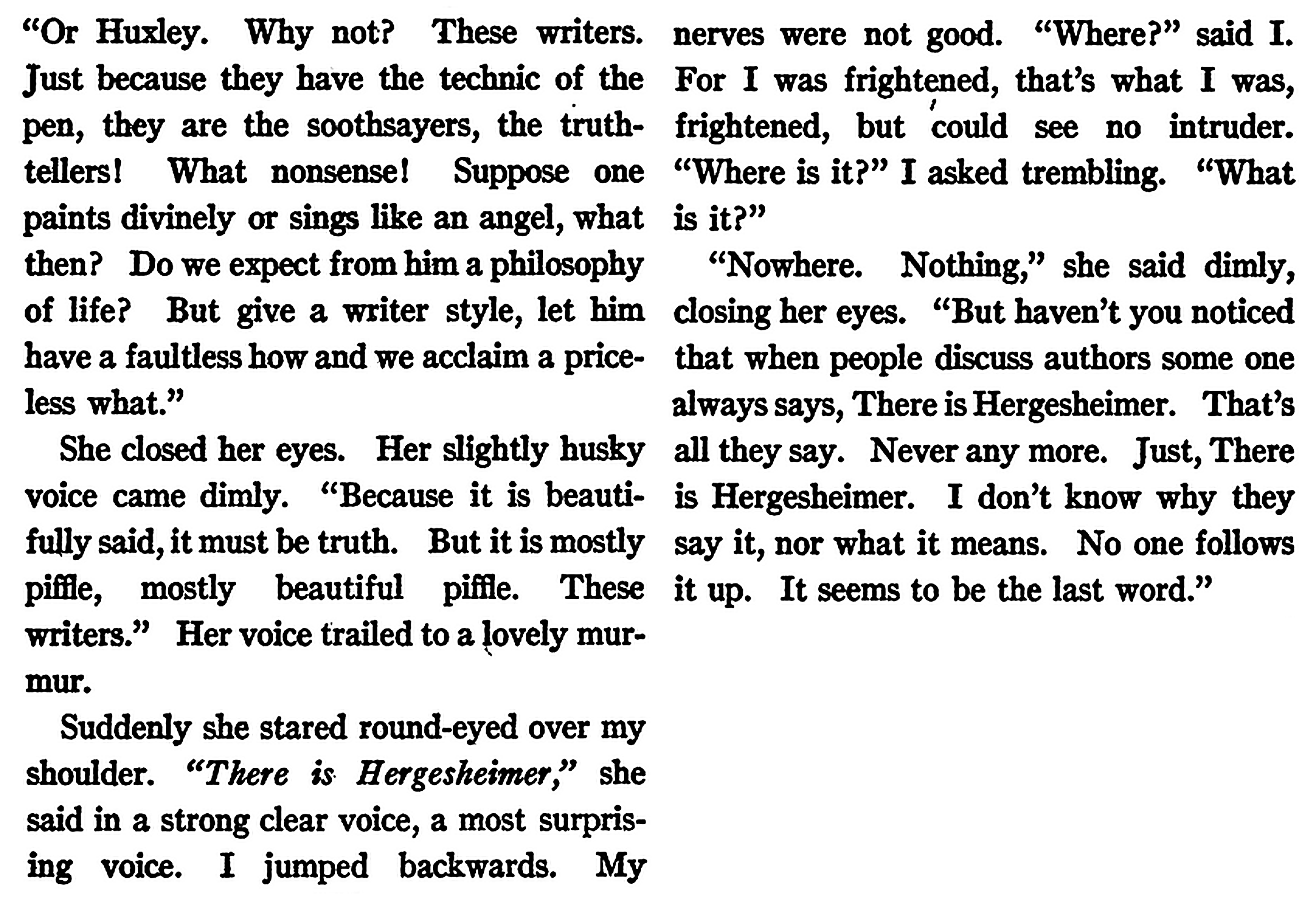 ***She wrote down his sentences (spelling without blemish in all the European languages) as they came from his lips, with the aid of a bright, efficient, new-looking typewriter. If he used a rare word or a whimsical construction, she would say, “I beg your pardon, Mr. Boon,” and he would at once correct it; and if by any lapse of an always rather too nimble imagination he carried his thoughts into regions outside the tastes and interests of that enormous ante-bellum public it was his fortune to please, then, according to the nature of his divagation, she would either cough or sigh or—in certain eventualities—get up and leave the room.***Many of the fragments would be at once put out of court as modern literature by the fact that they are written in pencil on both sides of the paper!***particularly the peculiar effect that the coincidence that both Nebraska and Nismes begin with an “N” and end so very differently, had had upon his imagination***I remember how Boon sat on the wall of his vegetable garden and discoursed upon James, while several of us squatted about on the cucumber-frames and big flowerpots and suchlike seats, and how over the wall Ford Madox Hueffer was beating Wilkins at Badminton. Hueffer wanted to come and talk too; James is one of his countless subjects—and what an omniscient man he is too!—but Wilkins was too cross to let him off….***He would touch a metaphor and then return and sip it, and then sip and drink and swill until it had intoxicated him hopelessly.***They are an incomplete report of the proceedings of a section S, devoted to Poiometry, apparently the scientific measurement of literary greatness.***