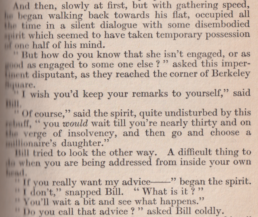 [Bonus: Section III (of seven sections total) is entitled, "A Few Telegrams." It makes me think of Mackail's buddy Wodehouse, of course; but Bill the Bachelor dates from 1922, i.e., roughly a decade prior to those telegram-heavy Jeeves and Bertie novels--though of course PGW may have used flurry-of-telegram business earlier elsewhere.]