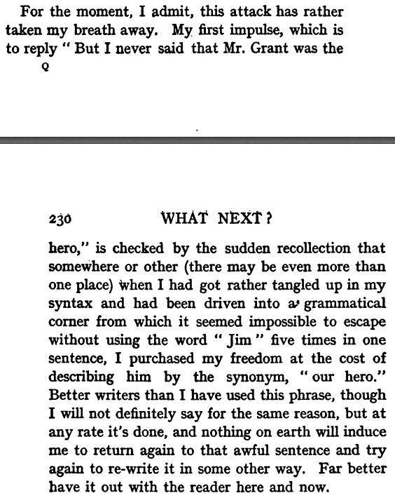 ***[Mr. Cash is a solicitor]The thought of this for some reason caused him to smile, which was so unheard-of a thing to occur in Mr. Cash's room that that gentleman stopped abruptly in the middle of the word "backwardisation" and said, "I beg your pardon, perhaps I am not quite clear?"***[Mis-finished Sentences dept.!]"Besides I should miss all your--""Proposals," suggested Jim hopefully...."Nonsense. 'Racing tips' was what I was going to say."***Ergo, what the dickens and everything else am I to say?[I guess "and everything else" is a sort of blank map of maledicta, eh?]***[Parenthetical!]"Let the explanatory and parenthetical Muse descend and address the reader."[See full passage attached. And then the sequel attachment, in which the narrator really sells the idea that his story is happening in real time.]***This "but------" was the curse of Jim's existence. The riddle of the sphinx and the problem of squaring the circle left him cold.***At about ten o'clock Mr. Cash, in illustrating a mannerism of the female mandrill, knocked over a bottle of brandy.***[On the Port Club's "magic" port wine, which can be deeply indulged with nary a hangover.]Oh unsurpassable and unequalled Port Club Port, two bottles of which will be but a pleasant memory to Messrs. Cash and Grant in the morning! Oh rare grape! Oh skilled bottler! Oh peerless vintage!--how I wish I had ever met you in real life!***He bent still further forward, and his eyeglasses fell off his nose and spun wildly on the end of the curly cord. [Wildly!]***"I was a professor of never mind what at a university in the North of England."***It is well known that once a reader starts skipping he never stops, but takes longer and wilder leaps each time.***One leg of his trousers had formed itself into a kind of spiral knickerbocker and barely descended below his knee. [The rare singular "knickerbocker."]***[Laughing in Turkish Baths dept.]He might, for instance, have a Turkish bath; that wouldn't cost much; but then he hated Turkish baths really. It was so difficult not to laugh in them.***...before you, or anyone else for that matter, could say "Robinson and Cleaver."[I had to look up "Robinson and Cleaver," which turns out to be a once-famous Victorian-era Belfast department store. And of course I appreciate the narrator's thoroughness in specifying that you or anyone else couldn't say it fast enough.]***"I've got to meet Father at half-past three at platform something-or-other."[It's none of my business, but I think this may be taking genericization too far for comfort!]***Jim had at all times the gift of the sort of sleep that no outward physical disturbance could arouse. From his earliest youth cold sponges had, so to speak, left him cold.***[See attached. In which the narrator defends his depiction of the protagonist to a hypothetical, indignant reader.]***[When you can't be bothered to do your own cussing.]"Damn!" said Lush."Ditto," said Jim.***"Damn and blast!" roared Jim...."Blast and damn!" he repeated, and was on the point of adding further words of a similar nature....***A torrent of quite unspeakable though silent oaths was radiating from Jim as from some raging high-powered wireless station. [Oh, if only this book were illustrated!]***the first night of the fifth edition of "Muffins and Crumpets"***[Wait for the epilogue! (attached)]***Bonus: A passing reference in this book to the delightful surname Snelgrove was my first encounter with it. Eager to make up for lost time, I visited Wikipedia to become Snelgrove-aware. There I discovered (Missed Opportunity Dept.) that the Canadian coffee chain Timothy's could have been called Snelgrove's! Goodness gracious, I have done business at Timothy's on, I think, multiple occasions, never knowing there was an implicit Snelgrove lurking!https://en.wikipedia.org/wiki/Timothy%27s_World_Coffee#Origin_and_background