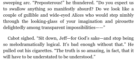 *** "He's a nice little man, but I think he has an awful lot of imagination. All his reasons for believing anything are terribly complicated, and he counts them off on his fingers. He holds up one finger and says, 'Point 1'; and then, when he has explained that, he holds up another finger and says, 'Point 2.'" [Later] "Now!" Carlo [the "nice little man"] paused, and Cabot knew without seeing it that he had raised a forefinger in the darkness. "Point 1...." *** "She sits there staring at me through those big glasses, and the glasses seem to get bigger and bigger." *** "I want you to give me the dope on that in something flat." *** "And Mr. Carlo Pugh....peering down into cupboards or drawers through a big round glass, like a man who was spying upon a pixy or sticking his nose into a leprechaun's business." *** "Everything seems impossible before breakfast."