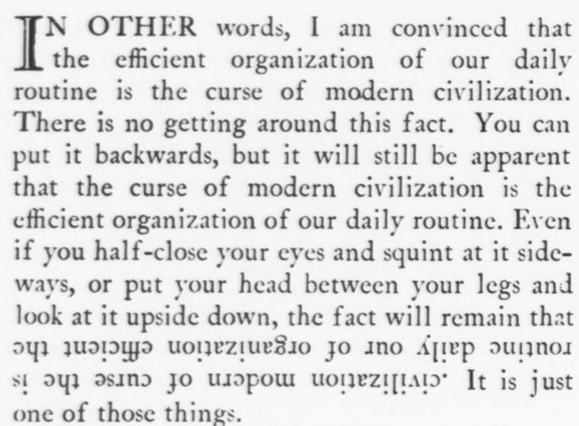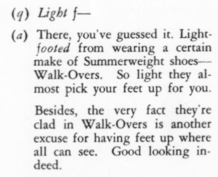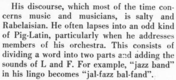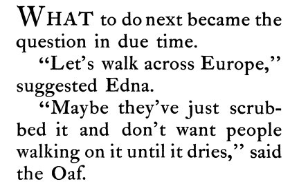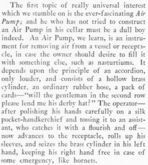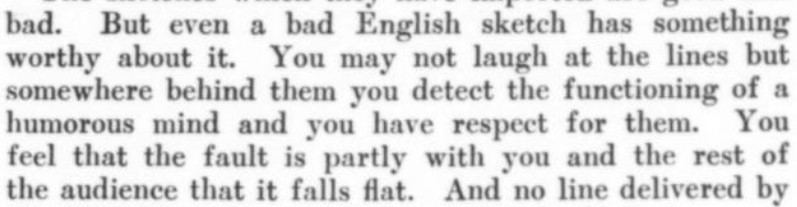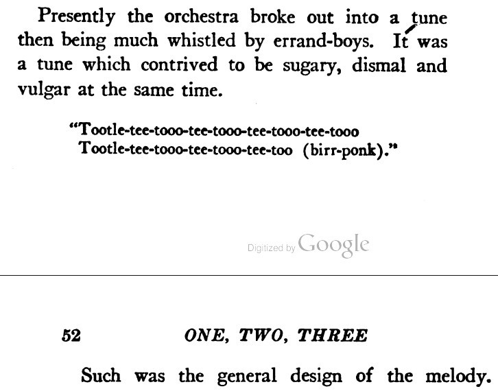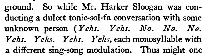 *** Some pranced like palfreys, others bounded like kangaroos....Some evidently strove to cover the maximum of space in the minimum of time, while others were pursuing the precisely opposite aim. There were some whose movements suggested that they were plotting graphs on the floor with their feet, and others who by the oscillatory maneoeuvres of their arms demonstrated that they were exponents of the pump-handle system of dancing. And then a select minority performed some esoteric rites by waggling their legs esoterically.