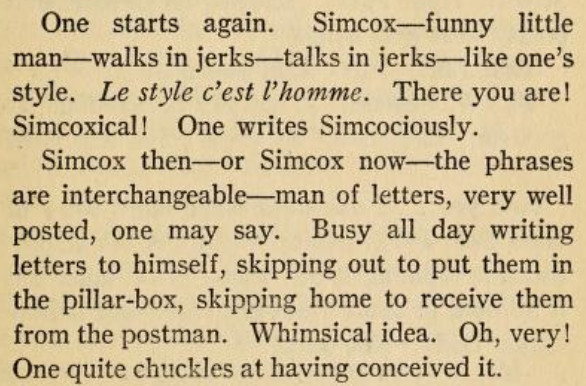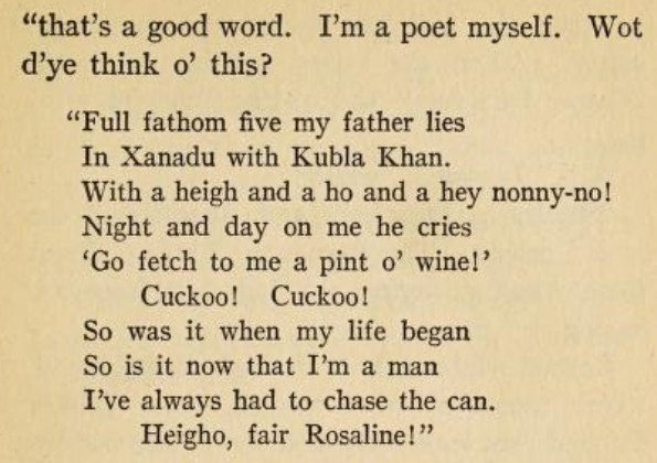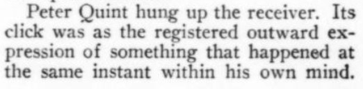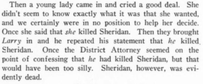***"I step into a little narrow alley and I peep round the corner. I peep with my eyes," and Waberski pointed to them with two of his fingers as though there was something peculiarly convincing in the fact that he peeped with them and not with his elbows.***The clocks in Dijon clash out and take up the hour from one another and pass it on to the hills.***Of course, Jim reflected, there was a strain of the mountebank in Hanaud....A strain of the mountebank indeed! He had a great deal of the mountebank. More than half of him was probably mountebank. Possibly quite two-thirds!"Oh, damn the fellow! What in the world did he notice?" cried Jim. "What did he notice from the top of the Tower? What did he notice in this hall? Why must he be always noticing something?" and he jammed his hat on in a rage and stalked out of the house.***[Who Needs Context? dept.]"The young lady," said Jim, "happens to be a port-manteau!"***To the amazement of them all Moreau began to laugh. Up till now he had been alert, competent and without expression. Stolidity had been the mark of him. And now he laughed in great gusts, holding his sides and then wringing his hands....Once or twice he tried to speak, but laughter leapt upon the words and drowned them."What in the world is the matter with you, Nicolas?" Hanaud asked."But I beg your pardon," Moreau stammered, and again merriment seized and mastered him. At last two intelligible words were heard. "We, Girardot," he cried, settling an imaginary pair of glasses on the bridge of his nose, and went off into a fit.***