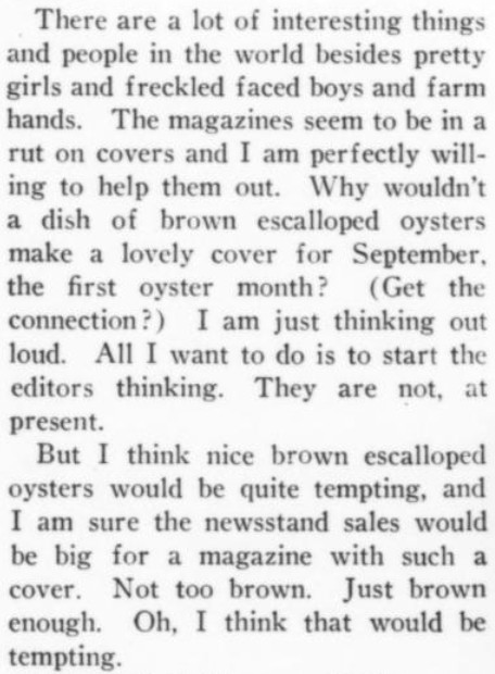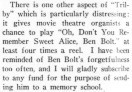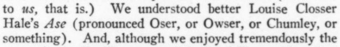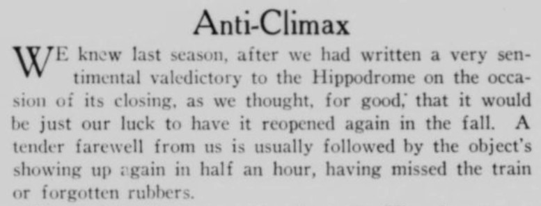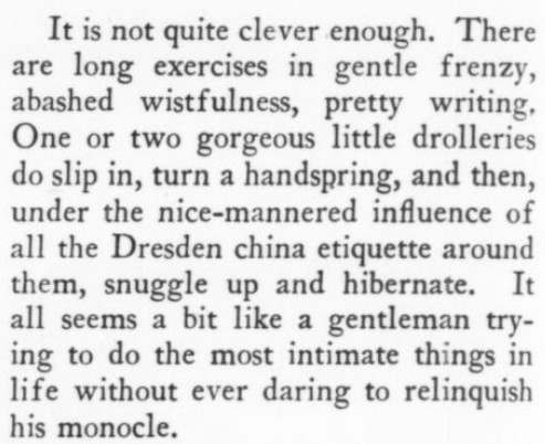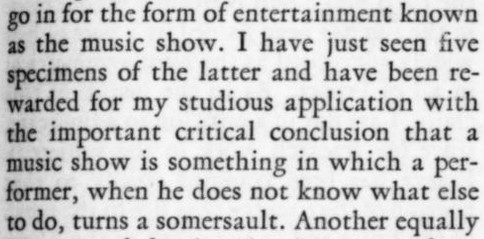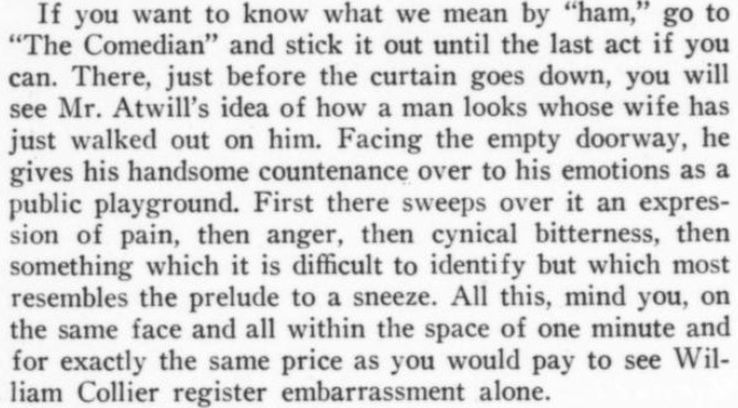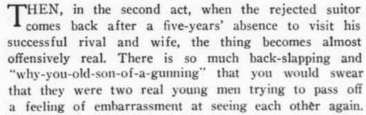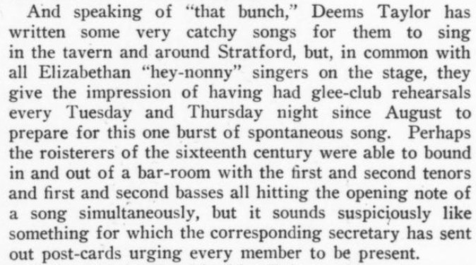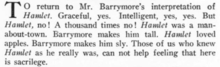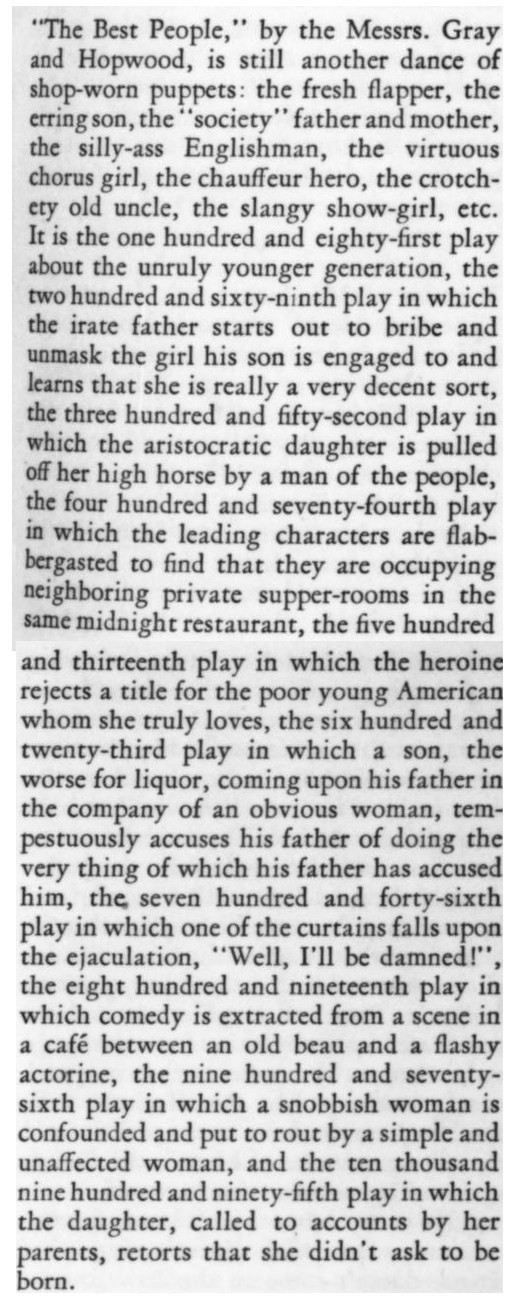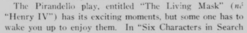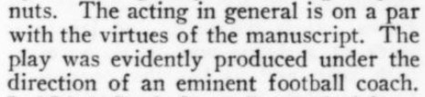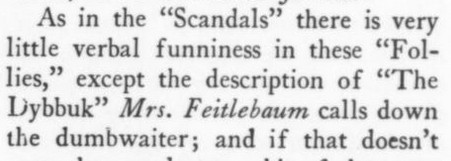 ***There is...that terrible moment at which one of the deck-hands hears the word "efficiency" and most comically asks, "What fish did you see?"***[Hello, Lola!] does not even live up to the standard of things called Hello, Lola!***Easter, a play twenty-five years old, looks and acts its age.***That portion of the public which likes to take its drama while lolling on the small of its intellect.***Add to them the delightful young giggler of one Phyllis Connard.***[Beau-Strings] is a cleverly dull evening.***["Playing along," in the Wilde]Dudley Digges, who directed [a 1926 revival of The Importance of Being Earnest] plays along capitally as the country curate.***...and twenty more Et Ceteras dutifully doing forty So Forths.***If so many Jims Corbett and Felixes Isman had not had their memories printed...***Notes on a few of the attachments:"Great Caesar's Ghost": Previously, I've encountered this only as an oath, never as an actual persona or archetype! (May be a one-off.)The "pin drop / Grant's tomb" item illustrates exactly that--a protagonist in a humor piece dropping the proverbial pin in the proverbially silent tomb.The incidental truncation that appears to read "cow Art" in the item labeled "yes" actually said "Moscow Art [Theater, I guess]"; but the layout had to make a detour around an illustration, as one does.