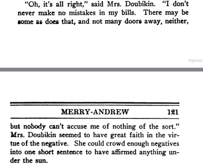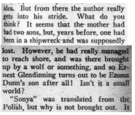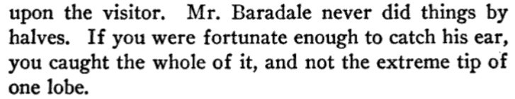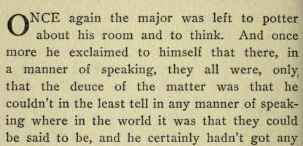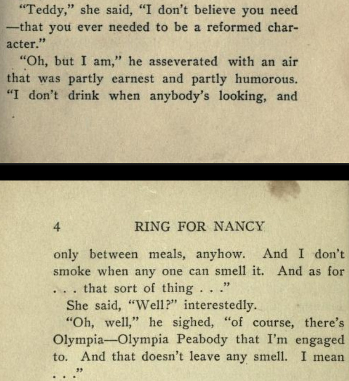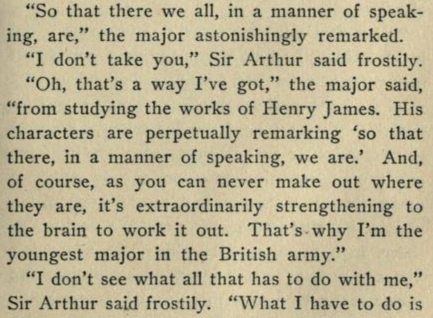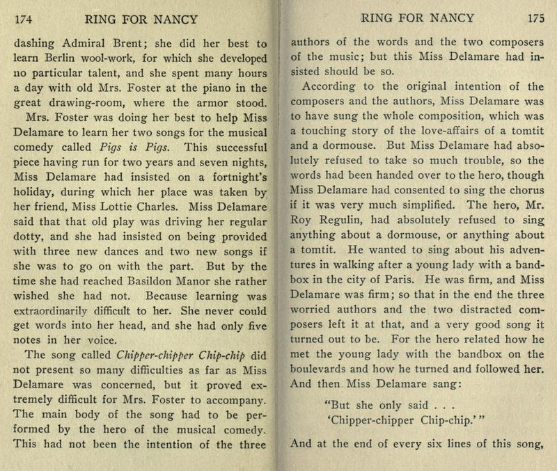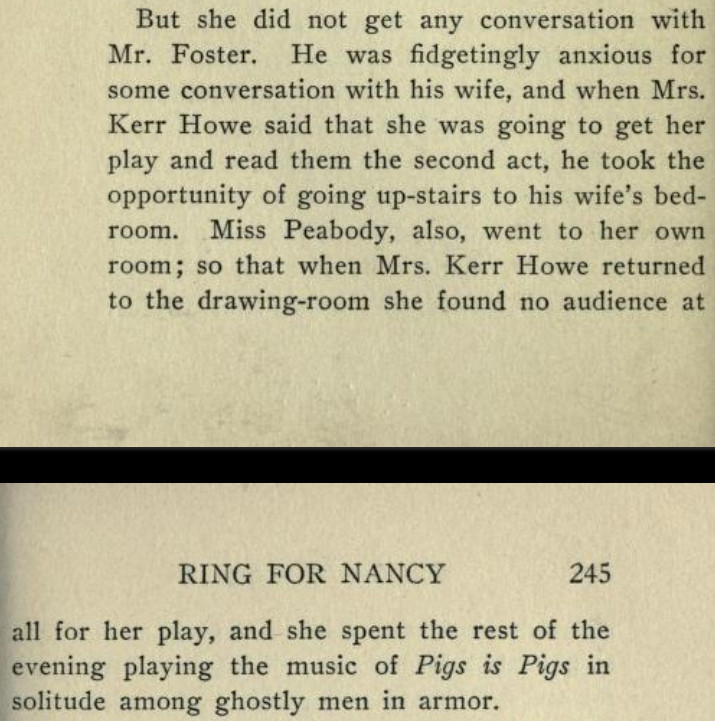 [*aka The Panel: A Sheer Comedy][**aka Ford Madox Ford][This is a strange book. At its best moments, it's not unlike the Lucia/Mapp novels, but much of it is rather a sordid, and at times tedious, soap opera. The best scene (see link below) I recommend in full; and, speaking as a writer, I suspect that scene might have originated as a freestanding story or humor piece that got wedged in here.]***"Oh, my aunt!" [...] "Oh, my uncle!"[It turns out these oaths are at least partially allusive to an actual aunt and uncle.]***"No, I was born in Peckham," the manager answered,--"silly Peckham."[I'm not sure why Peckham is or was silly, but I'll take it. Fwiw, Wikipedia does note that "the late 19th century also saw the arrival of George Batty, a manufacturer of condiments."]***[Okay, now for the "big scene," which follows up a railway-station incident early in the book and relates to the attached Henry James business (thus raising a chicken-and-egg question regarding the inclusion of that, as well as this, in the book to begin with). The link should take you to Part III, chap. IV:]https://archive.org/details/ringfornancyshee00fordrich/page/278/mode/1up?view=theater[Many snippets attached. Note: While I wouldn't put it past the showbiz folks, then or now, to turn the short story "Pigs Is Pigs" into a full-blown musical comedy, I find no evidence that this actually happened--so Ford is pulling our leg with that, and the songs can be filed under Nonexistent Songs from Nonexistent Musicals Based on Actual Literature.]