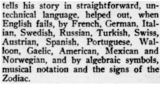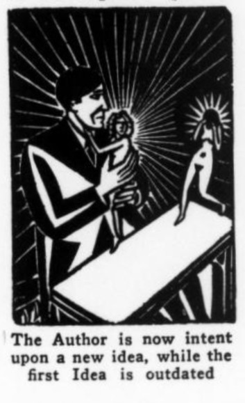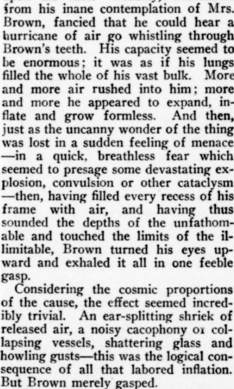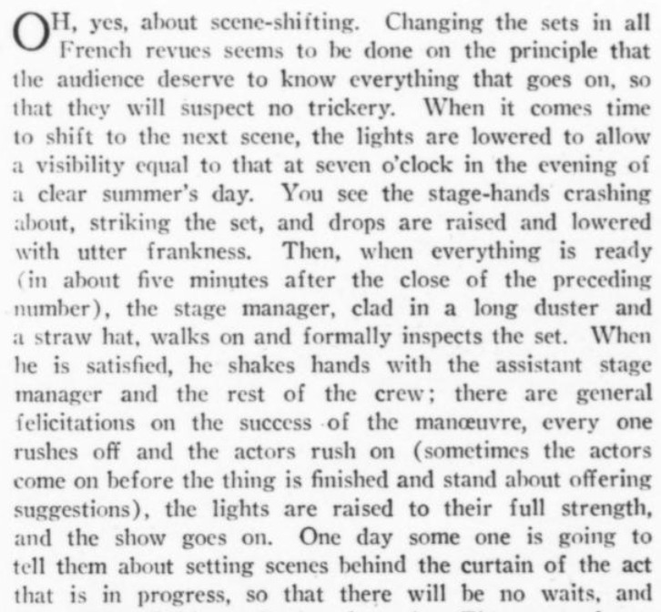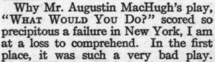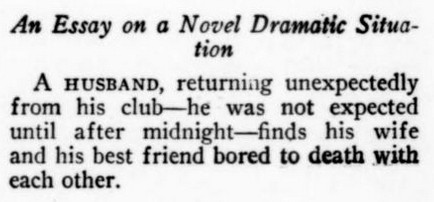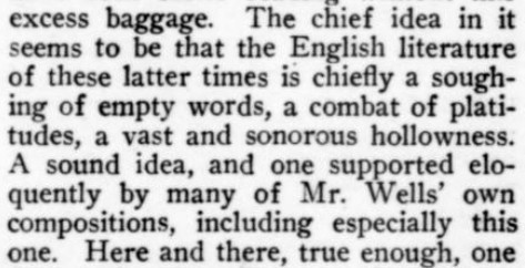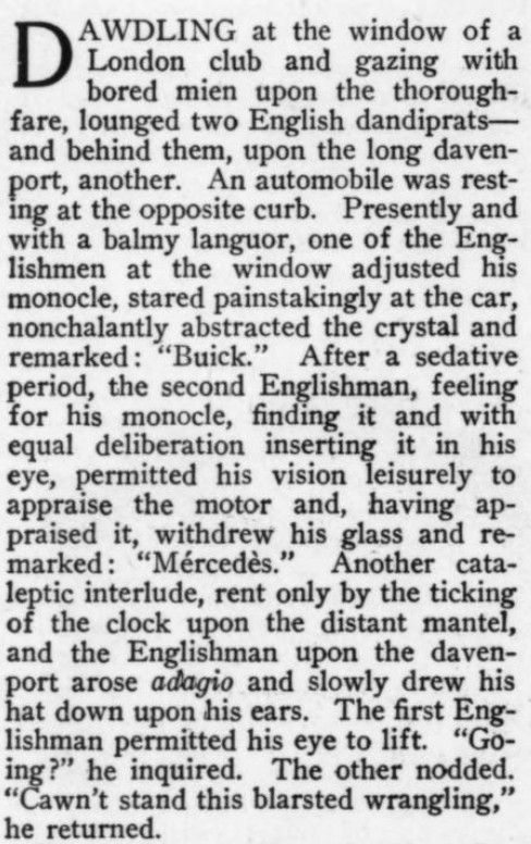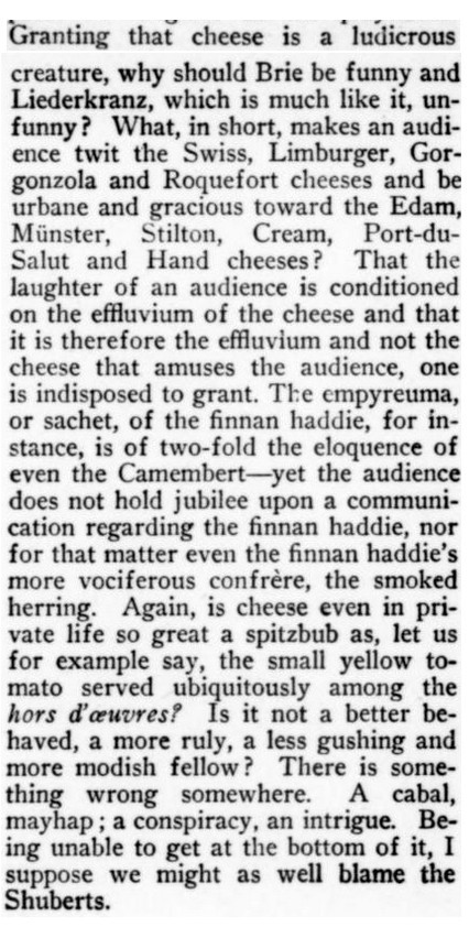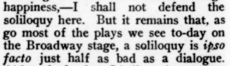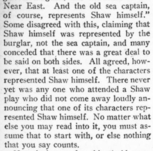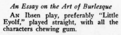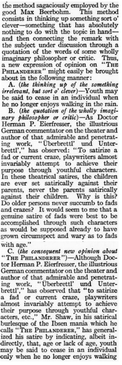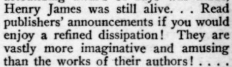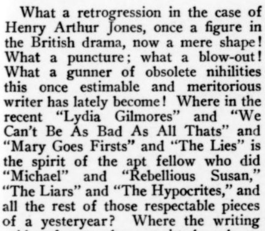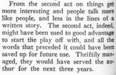 ***[Shaw's play Getting Married] reminds one of a Wilde epigram rewritten by Dostoievsky. [Nathan]***Anyone can write a play but...it takes genius to sit through one. [Nathan; not sure if this quip is original to him]***all its winsome et ceteras [Nathan]***Miss Cather and Mrs. Watts have yet to strike twelve. [Mencken]***ideas rolled out like noodles [Mencken]***the grave and literal-minded critical whisker [Nathan]***Bonuses:Nathan uses "jabberwock" as a transitive verb (something a playwright does to the audience by entertaining them with playful nonsense).He also uses the adverb "Johnsonianly" (i.e., in the manner of Dr. Johnson).[And the same day I encountered that, I subsequently encountered the assertion, in an unrelated book from 1921, that Fanny Burney wrote "a kind of debased Johnsonese."]He describes a play called /The Basker/ as a "monocled dawdle"Notes on a couple of the attachments:1. Re. "more this anon": This sentence, article, and entire *issue* appear to break off in the middle of a word! Mencken is both the author and co-editor, so in a way he's self-empting. (And I note that I saw no evidence of the sentence or article picking up again in the subsequent issue.)2. I've included the tobacco ad simply because of its over-the-top off-topicness in confusing itself with a coffee ad. (I subsequently saw another one in the series, with some other fragrant non-tobacco substance featured.)