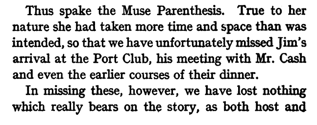 ***[Mr. Cash is a solicitor]The thought of this for some reason caused him to smile, which was so unheard-of a thing to occur in Mr. Cash's room that that gentleman stopped abruptly in the middle of the word "backwardisation" and said, "I beg your pardon, perhaps I am not quite clear?"***[Mis-finished Sentences dept.!]"Besides I should miss all your--""Proposals," suggested Jim hopefully...."Nonsense. 'Racing tips' was what I was going to say."***Ergo, what the dickens and everything else am I to say?[I guess "and everything else" is a sort of blank map of maledicta, eh?]***[Parenthetical!]"Let the explanatory and parenthetical Muse descend and address the reader."[See full passage attached. And then the sequel attachment, in which the narrator really sells the idea that his story is happening in real time.]***This "but------" was the curse of Jim's existence. The riddle of the sphinx and the problem of squaring the circle left him cold.***At about ten o'clock Mr. Cash, in illustrating a mannerism of the female mandrill, knocked over a bottle of brandy.***[On the Port Club's "magic" port wine, which can be deeply indulged with nary a hangover.]Oh unsurpassable and unequalled Port Club Port, two bottles of which will be but a pleasant memory to Messrs. Cash and Grant in the morning! Oh rare grape! Oh skilled bottler! Oh peerless vintage!--how I wish I had ever met you in real life!***He bent still further forward, and his eyeglasses fell off his nose and spun wildly on the end of the curly cord. [Wildly!]***"I was a professor of never mind what at a university in the North of England."***It is well known that once a reader starts skipping he never stops, but takes longer and wilder leaps each time.***One leg of his trousers had formed itself into a kind of spiral knickerbocker and barely descended below his knee. [The rare singular "knickerbocker."]***[Laughing in Turkish Baths dept.]He might, for instance, have a Turkish bath; that wouldn't cost much; but then he hated Turkish baths really. It was so difficult not to laugh in them.***...before you, or anyone else for that matter, could say "Robinson and Cleaver."[I had to look up "Robinson and Cleaver," which turns out to be a once-famous Victorian-era Belfast department store. And of course I appreciate the narrator's thoroughness in specifying that you or anyone else couldn't say it fast enough.]***"I've got to meet Father at half-past three at platform something-or-other."[It's none of my business, but I think this may be taking genericization too far for comfort!]***Jim had at all times the gift of the sort of sleep that no outward physical disturbance could arouse. From his earliest youth cold sponges had, so to speak, left him cold.***[See attached. In which the narrator defends his depiction of the protagonist to a hypothetical, indignant reader.]***[When you can't be bothered to do your own cussing.]"Damn!" said Lush."Ditto," said Jim.***"Damn and blast!" roared Jim...."Blast and damn!" he repeated, and was on the point of adding further words of a similar nature....***A torrent of quite unspeakable though silent oaths was radiating from Jim as from some raging high-powered wireless station. [Oh, if only this book were illustrated!]***the first night of the fifth edition of "Muffins and Crumpets"***[Wait for the epilogue! (attached)]***Bonus: A passing reference in this book to the delightful surname Snelgrove was my first encounter with it. Eager to make up for lost time, I visited Wikipedia to become Snelgrove-aware. There I discovered (Missed Opportunity Dept.) that the Canadian coffee chain Timothy's could have been called Snelgrove's! Goodness gracious, I have done business at Timothy's on, I think, multiple occasions, never knowing there was an implicit Snelgrove lurking!https://en.wikipedia.org/wiki/Timothy%27s_World_Coffee#Origin_and_background