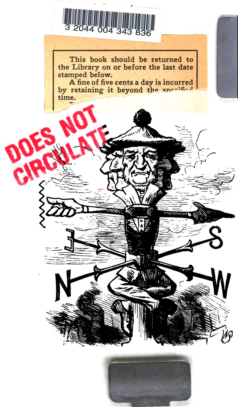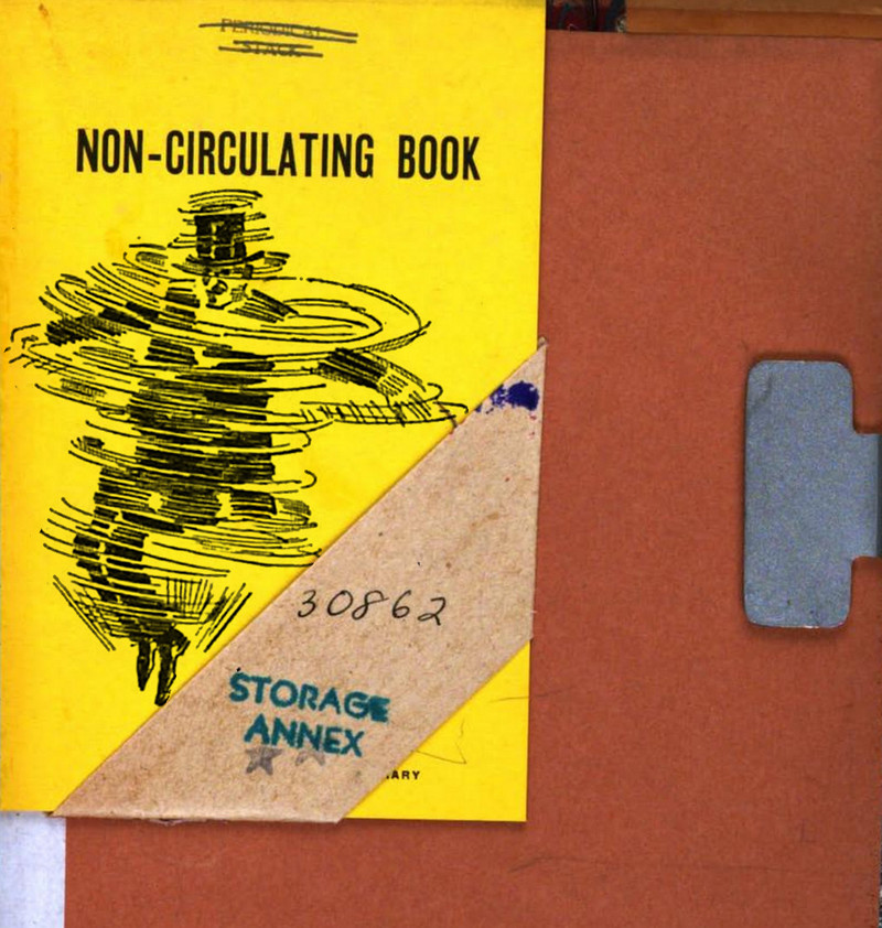 Some library books, for a variety of reasons, become "non-circulating." They no longer move in a circular path (according to the Latin root of circulate). And they are stamped to this effect, with words like "room use only," "may not be checked out," and "under no circumstances to be taken from the building." It's a precious status, indicative of value, rarity, and refererence-worthiness. Yet there's a tinge of sadness, too — a hint of decrepitude and dormancy. We asked a book-whisperer and learned that books do wish to circulate, to be worldly, to mingle, to be at large. And so, as our eccentric research takes us through the digital collections of libraries around the world, we keep a special eye out for non-circulating books. We check their endpapers for the scarlet lettering of "library use only." Then, through a painstaking process involving collaged elements from non-circulating volumes of old magazines, we add some talisman-like flowing imagery to break the stagnation. Swirling lines, spinning figures, twirls and loops and spirals — we add dynamism to counteract the inertia and invite the moribund book to spin off (if only in its dreams, or as a greeting card). We thank the industrious archivists who scan rare books for a wider readership to discover and appreciate.