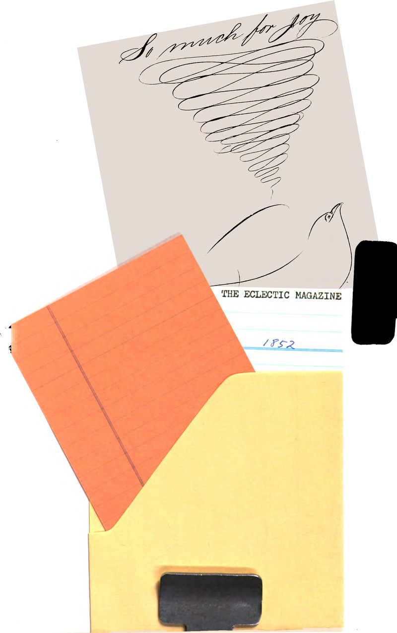 Some library books, for a variety of reasons, become "non-circulating." They no longer move in a circular path (according to the Latin root of circulate). And they are stamped to this effect, with words like "room use only," "may not be checked out," and "under no circumstances to be taken from the building." It's a precious status, indicative of value, rarity, and refererence-worthiness. Yet there's a tinge of sadness, too — a hint of decrepitude and dormancy. We asked a book-whisperer and learned that books do wish to circulate, to be worldly, to mingle, to be at large. And so, as our eccentric research takes us through the digital collections of libraries around the world, we keep a special eye out for non-circulating books. We check their endpapers for the scarlet lettering of "library use only." Then, through a painstaking process involving collaged elements from non-circulating volumes of old magazines, we add some talisman-like flowing imagery to break the stagnation. Swirling lines, spinning figures, twirls and loops and spirals — we add dynamism to counteract the inertia and invite the moribund book to spin off (if only in its dreams, or as a greeting card). We thank the industrious archivists who scan rare books for a wider readership to discover and appreciate.