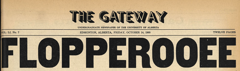 The word "flopperooee" appears to be exclusive to this newspaper, and it even made the banner headline.  From The Gateway, 1960.
