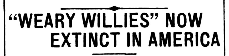 "'Weary willies' now extinct in America."  From The Duluth Herald, 1920.