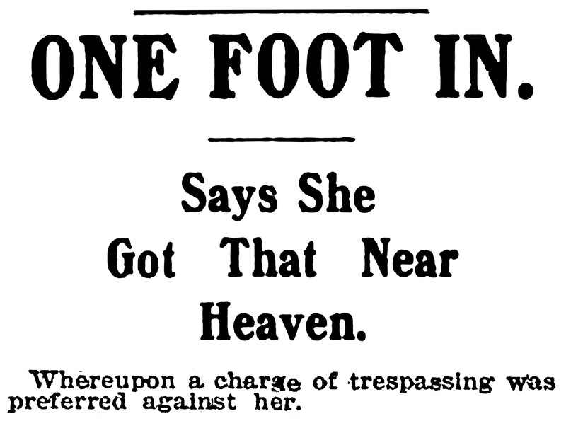 One foot in heaven brought trespassing charges.  From the Duluth Evening Herald, 1901.