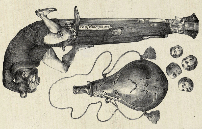 Here's a precursor to the slogan, "Guns don't kill people; people kill people."  It's a pistol made of people, from La Caricature, 1833.