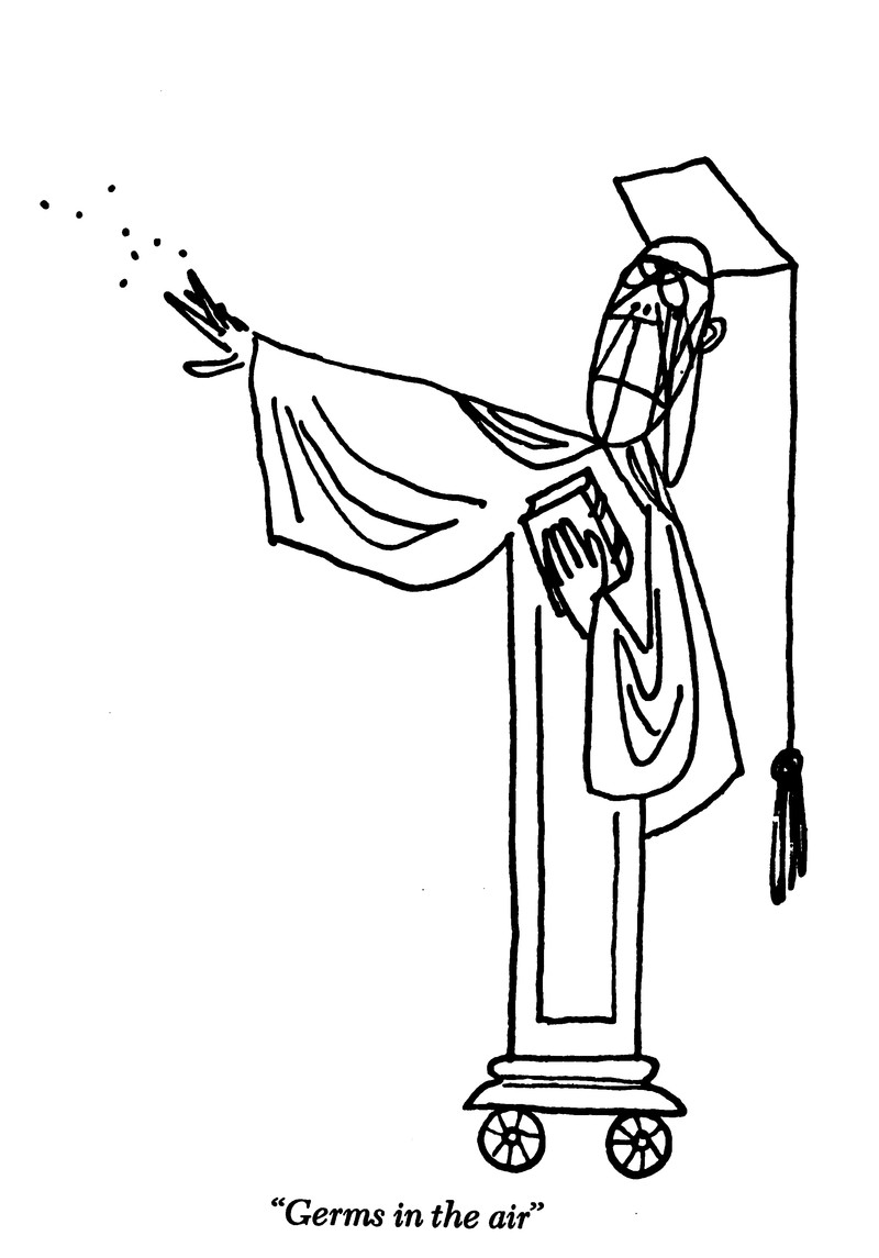 Hmm, what does this remind me of? An unelected expert on a pedestal, proclaiming that there are germs in the air, from Listen, Little Man! by Wilhelm Reich and illustrated by William Steig.