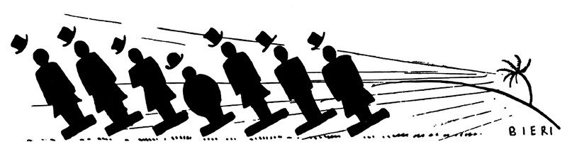Here's a precursor to the eerie atomic bomb test with mannequins in the Nevada desert in the 1950s.  From Der Bärenspiegel, 1930.