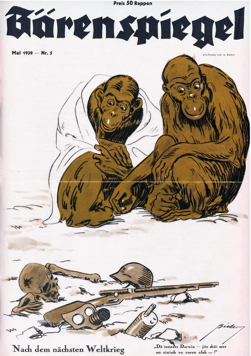 Here's a precursor to Planet of the Apes, 24 years before the novel was published.  From Der Bärenspiegel, 1939.