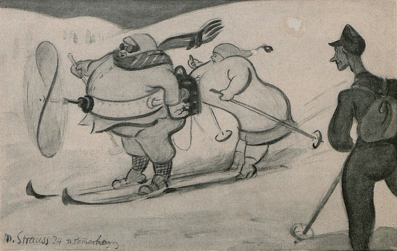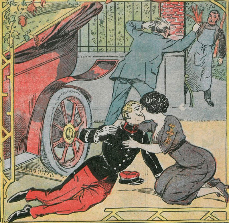 Putting the basket on the hood is as good a way as any to show the world that you're the sort of person who goes on picnics. From Lustige Blätter, 1916. We're designating this a precursor to Mrs. Bucket in Keeping Up Appearances driving around with snow skiis sticking out of her car to show the neighbors that she's the sort of person who might go skiing.