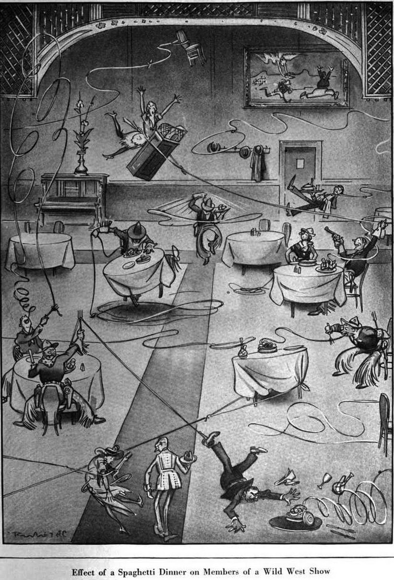 Here's a "spaghetti western," 40 years before the phrase was coined. The caption says, "Effect of a spaghetti dinner on members of a wild west show." From Life, 1923.