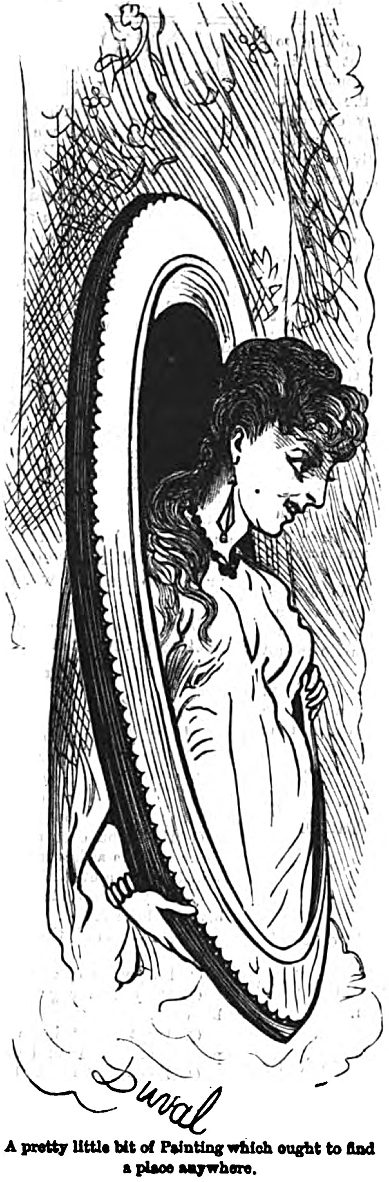 Here's a precursor to the Pepper's Ghost illusions gracing the spooky portaits in Disneyland's Haunted Mansion. From Judy, Or The London Serio-Comic Journal, 1875.