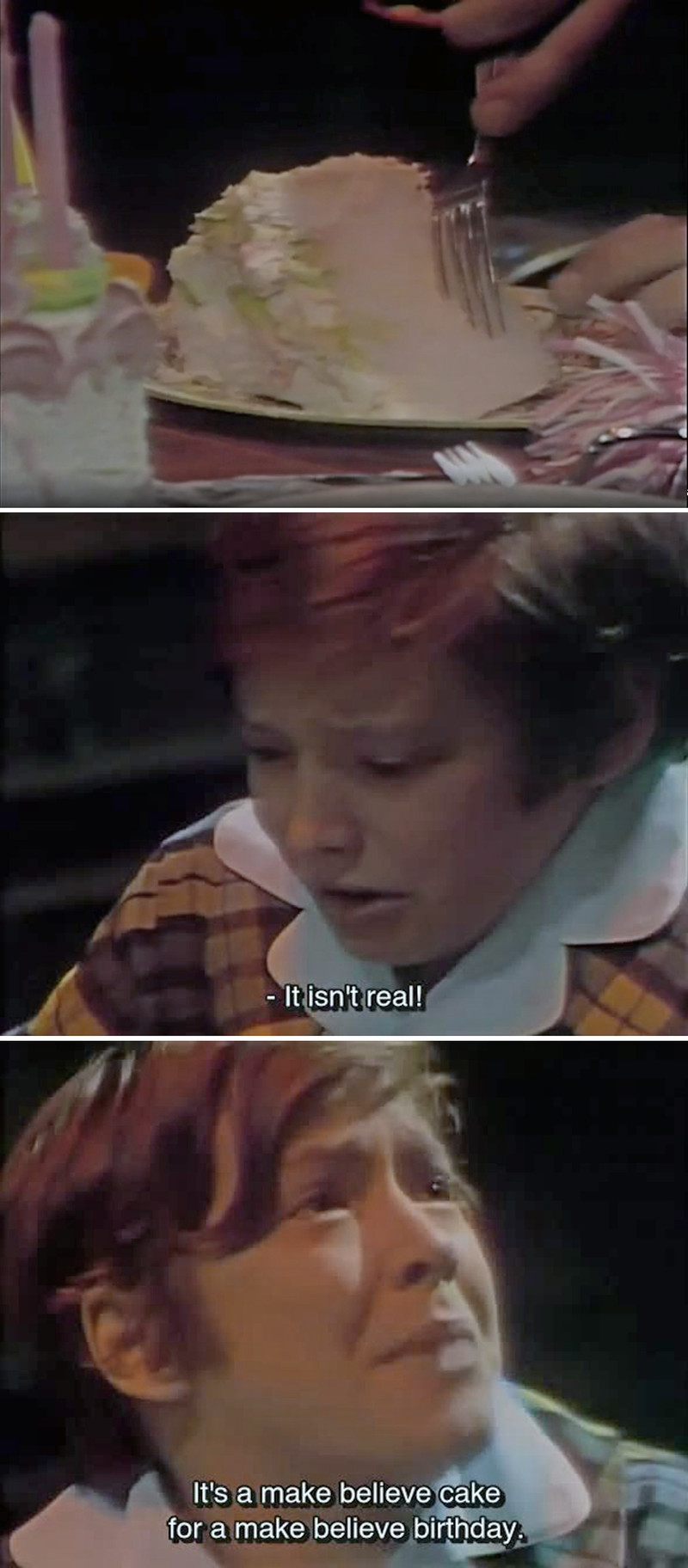 Here's a precursor to "The cake is a lie" meme from the 2007 video game Portal. "It isn't real! It's a make-believe cake for a make-believe birthday." From Dark Shadows episode 767.