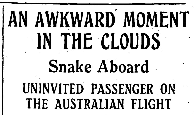 Here's a precursor to Snakes On a Plane: "An awkward moment in the clouds. Snake aboard. Uninvited passenger on the Australian flight." From The Children's Newspaper, 1928.