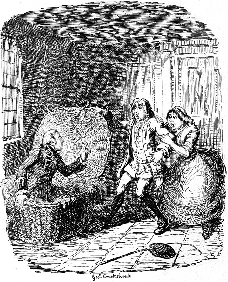 Here's a precursor to Basil Fawlty and Polly discovering Manuel in a laundry basket (in the episode "The Kipper and the Corpse"), from The Works of Henry Fielding, illustrated by George Cruikshank, 1845.