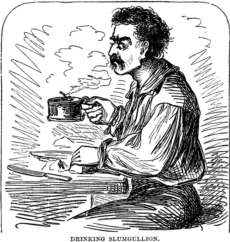 Merriam-Webster suggests that the first known use of slumgullion (a meat stew reminiscent of the slime [slum] from a cesspool [gullion]) was 1890. We can do better than that, with this one from 1872, in Mark Twain's Roughing It.