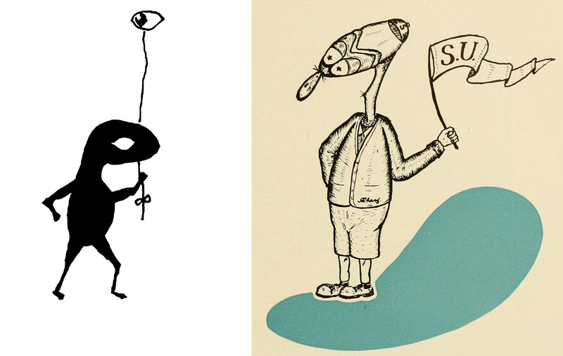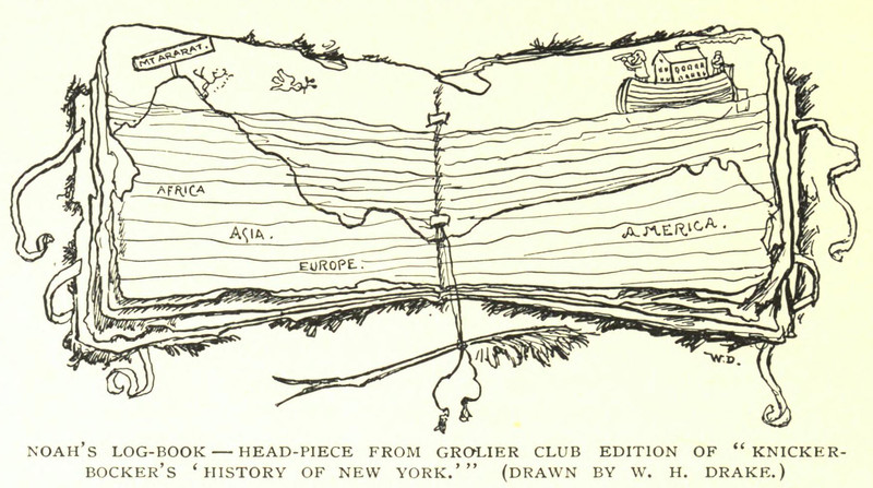 A precursor to the famous New Yorker cover of the compressed map showing New York's view of the world. It's Noah's Log-Book, from The Century Illustrated, 1889.